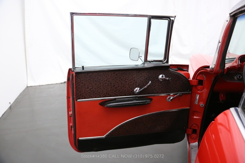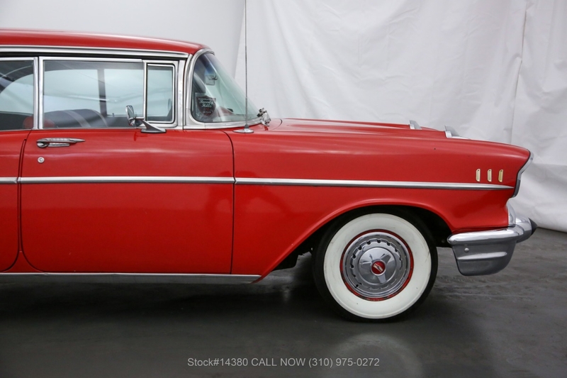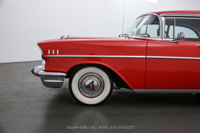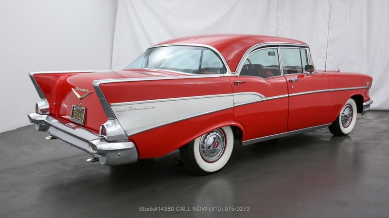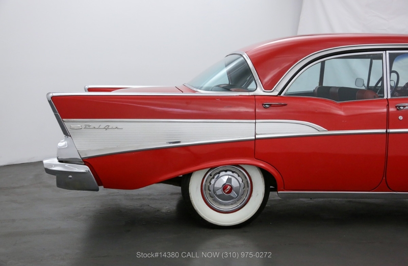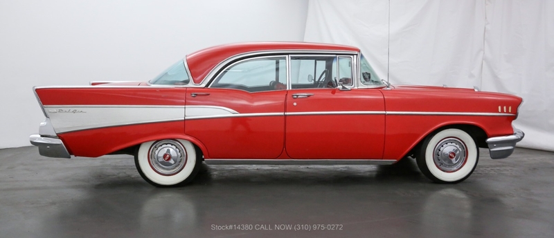 1957 Chevrolet Bel Air 4-DoorNo-Post Hardtop SedanThis weekend cruiser 1957 Chevrolet Bel Air 4-Door No-Post Hardtop Sedan is available in red with a red and black interior. The vehicle comes equipped with an automatic transmission, V8 engine, steel wheels, whitewall tires, and spare tire. An original black plate California car that is mechanically sound. For $26,500