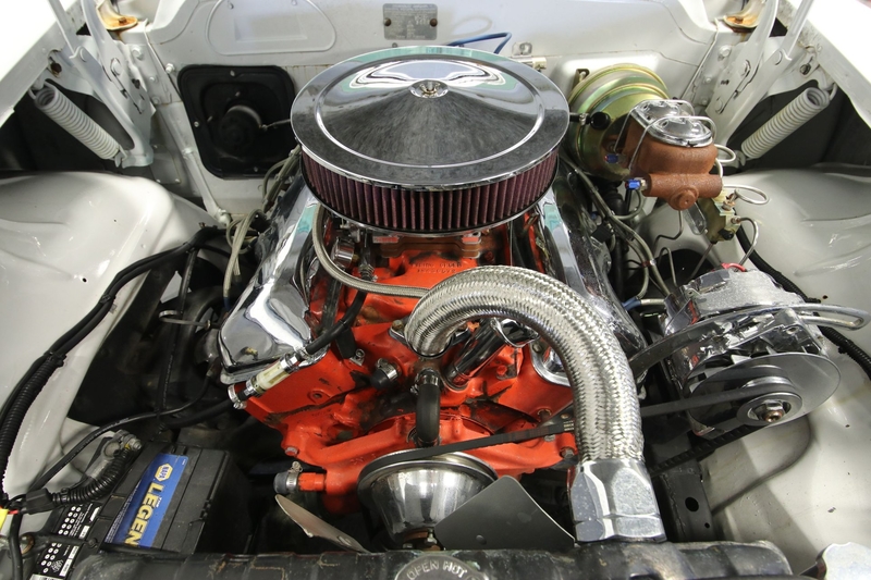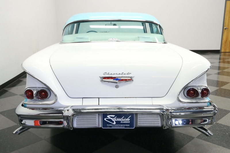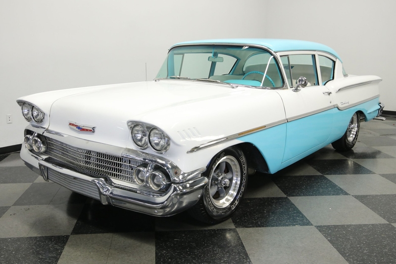 The 1958 Chevrolet introduced big block power to the cars. While the legendary 409 cubic-inch V8 size was still a few years away when this one was built, we now know the engine bay can accept it with ease. So that's exactly what they did here for this true street machine style classic. And while you'll like the extra polish of the valve covers, air grabber, alternator, and more, the real attraction is that this 409 also inhales deeply with an Edelbrock four-barrel carburetor. It fires up nicely while making the right deep tone from the dual exhaust. It's both powerful and smooth as you take full control with the four-speed manual transmission. This feels good out on the road, especially with wide modern tires, upgraded power brakes, and front discs with drilled and slotted rotors.