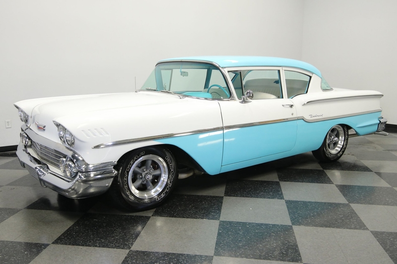 General description : This 1958 Chevrolet Delray 409 is a cool two-tone sleeper like you'd see back in the day. After all, beneath the shining bright chrome is a serious big block heart and the control of four-on-the-floor. So it's time to have so fun with the old-school blacktop burner.
