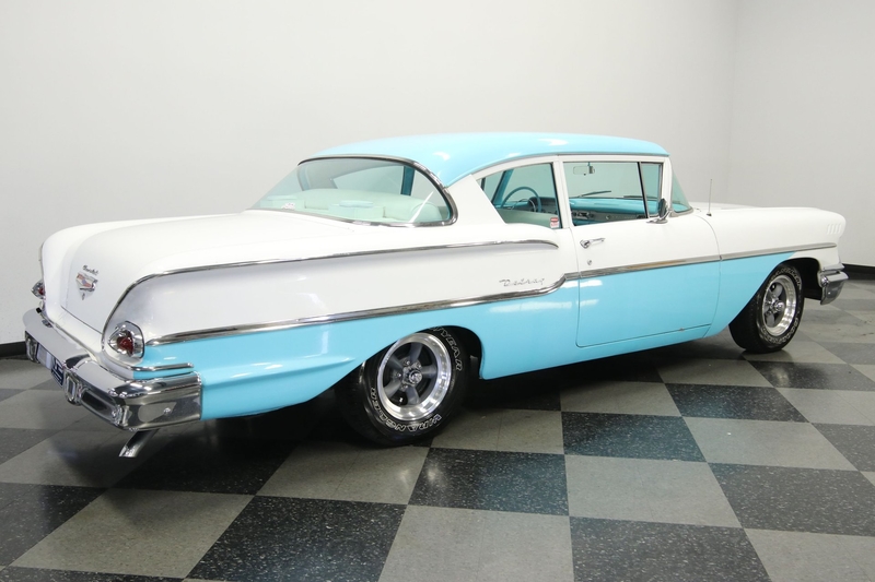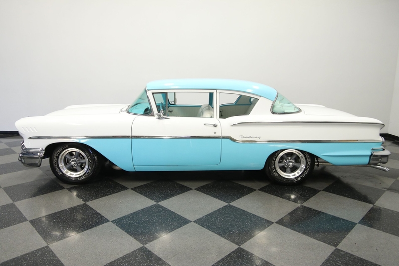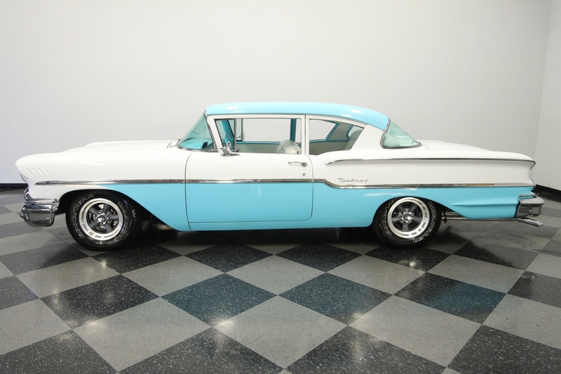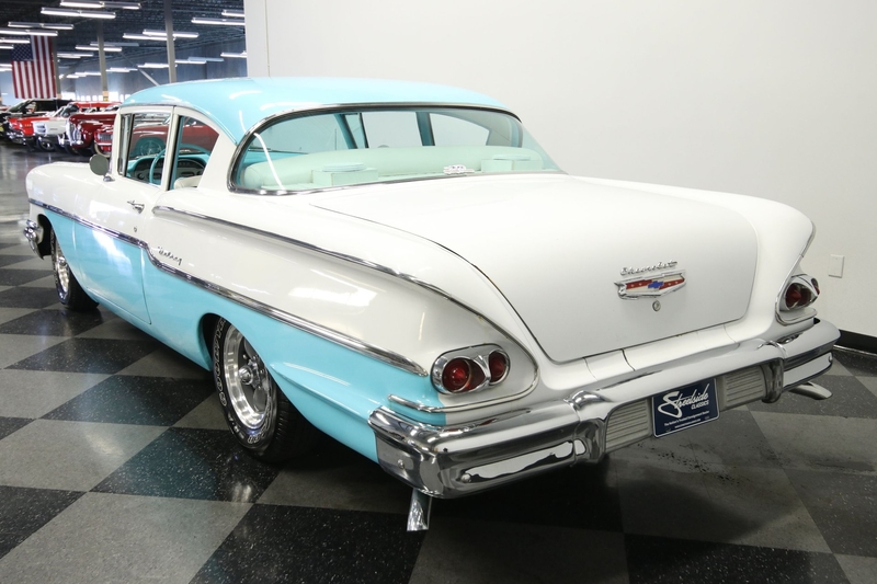 We already are big fans of the '58 Chevy. After all, it's a single-year design that was built with a wide style to own the streets. That's why you see the quad headlights and a broad chrome grille. It's detail-oriented, too, like the way the lower rear fenders have a rising crease so that it can meet the line of the rear bumper. You can see all of it so well, because this car has a ton of brightwork, and it all looks clean and complete. This attractive trim is even used to divide the Cashmere Blue and Arctic White. The bright two-tone seems like the ideal 1950s color combo, and that really goes to the heart of this car. It has a great classic style, and utilizes the base Delray body, so it's exactly the way people built some of the best street machines. In fact, you may not even really pick up on this Chevy's upgraded nature if you don't spot the raised white letter tires and competition-style American Racing Torq Thrust wheels.