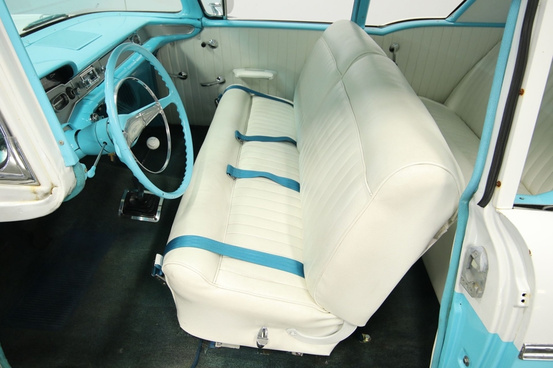 The two-tone interior continues this car's clean and unassuming style. In fact, you're likely to be more impressed with how this full-size two-door sedan offers plenty of room and seating finished in a supple white leather. There are nice details, like how the upholstery pattern on the seats is repeated on the doors. Plus, the custom/comfy high rear seatback has a blue Chevy bow tie, and there are matching seatbelts in the front. The dash has the bright and classic look. Even the AM/FM digital tuner is a retro-style one to keep the whole atmosphere feeling vintage. The artful blue and chrome steering wheel has that ideal thin/grippy classic feel, but Hurst floor shifter reminds you there's more to this one than just nostalgia.