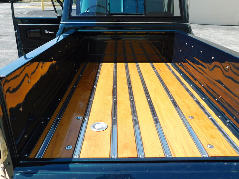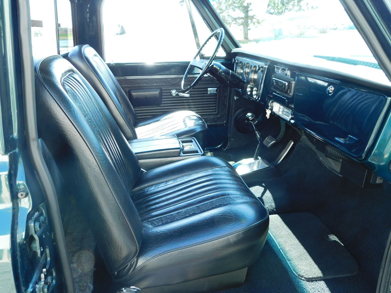 The vehicle has been painted in a slightly modified Metallic Forest Green. The metal flakes are smaller, more dense, and has had a tinge of blue pearl added to really make this color pop in the sunlight. Step into the Black vinyl interior and find yourself quite cozy. If the interior looks familiar, that's because it was pulled from a 1969 Blazer to give a slight twist on this classic, without losing the original flavor.