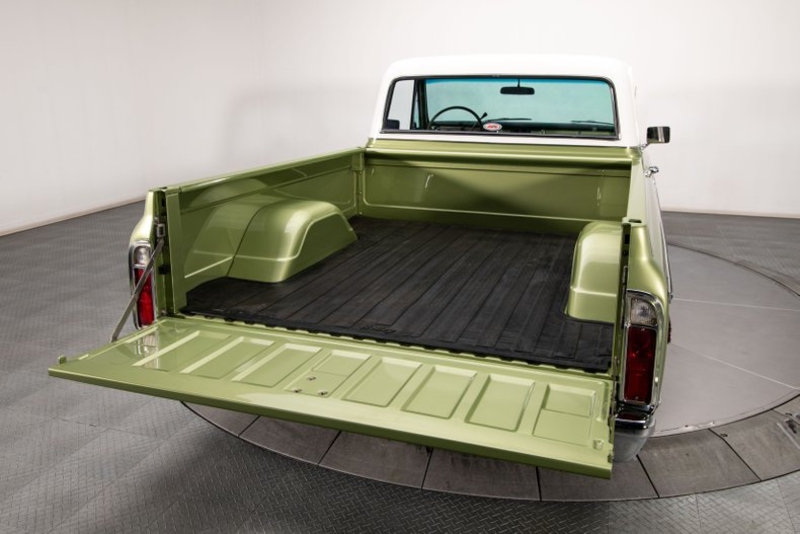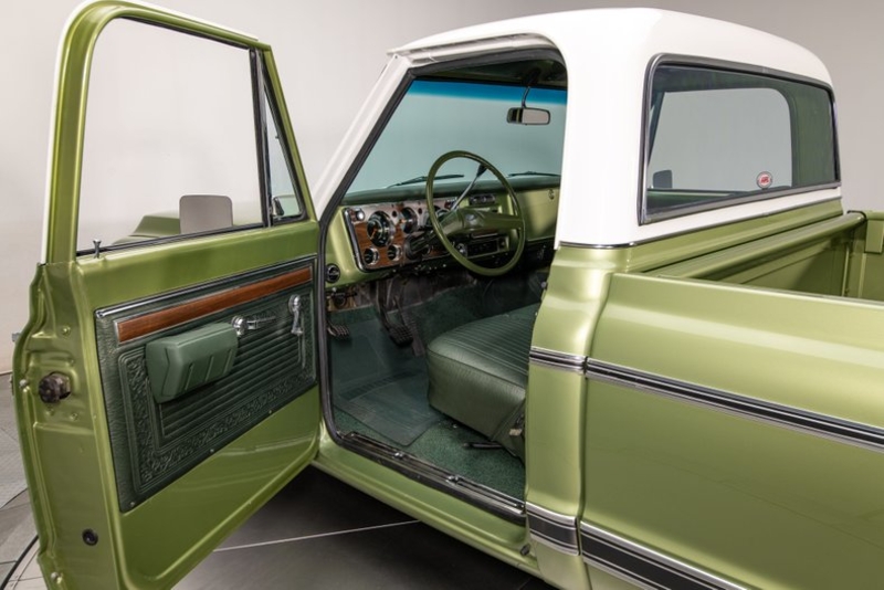 Roughly 3,000 miles out of a detailed, ground-up restoration, this super cool pickup features a solid steel body that's been completely stripped, completely disassembled and carefully refinished in a correct combination of White and Medium Olive two-stage. That thoroughly massaged profile centers beautiful fit and finish under bright reflections that bounce off Kansas-flat surfaces. And naturally, those factory-spec planes present a roster of tasteful details. At the front of the truck, an intricate grille flies a bold 'C H E V R O L E T' banner between modern Hella headlamps, traditional parking lamps and a fresh stainless shell. A fresh bumper guards a legendary short bed profile that floats crisp markers and fresh door handles amid ornate Chevrolet Custom trim. A domed hood, led by a familiar blue bowtie, fronts a crisp greenhouse, which stretches quality LLumar 80 tint and correct Custom frames between satin wipers and polished wipers. A 'C H E V R O L E T' branded tailgate seals a painted bed that's been equipped with a relocated fuel filler and a rugged Holley cargo mat. And out back, traditional taillights illuminate a second fresh bumper.