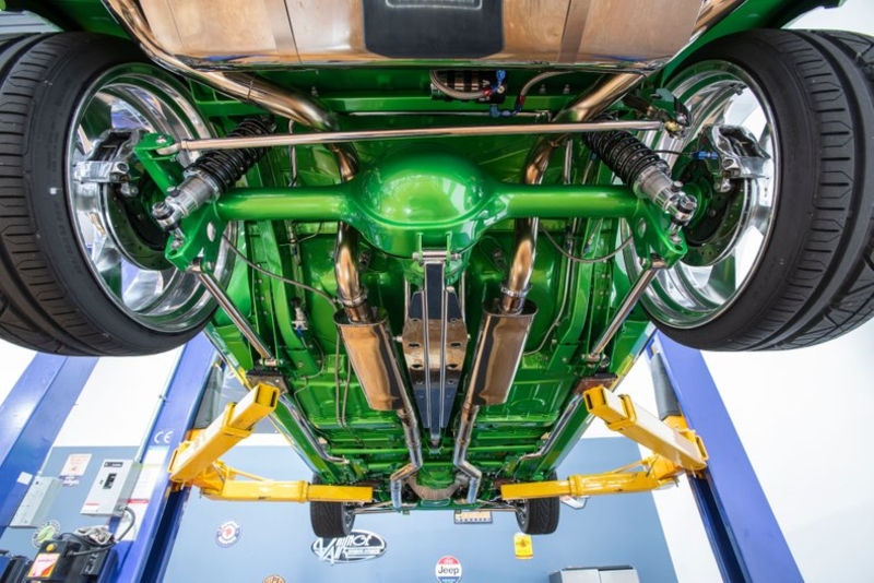Pose this panther on a lift and you'll find solid, over-restored floors that provide a stellar backdrop for some of the best aftermarket hardware on the market. A tough hydraulic clutch kicks a tough Tremec 5-speed, which twists power to a 9-inch axle that's finished with big, 4.11 gears. Beneath that drivetrain, a reimagined suspension employs power rack-and-pinion steering and a TCI Pro Touring IFS in front of polished connectors and a TCI Torque Arm Rear Suspension. A proven Wilwood master cylinder cinches polished Wilwood calipers around a quartet of drilled and slotted rotors. Charred dinosaurs float into rowdy mufflers that, like the car's pipes, are fully polished. A polished fuel tank makes excellent use of an electronic Holley pump and a polished Edelbrock filter. And torque transitions to pavement through Billet Specialties Rat Tails, which wear 235/40ZR18 Nitto Neo Gens in front of 255/30R22 Nitto Invos.