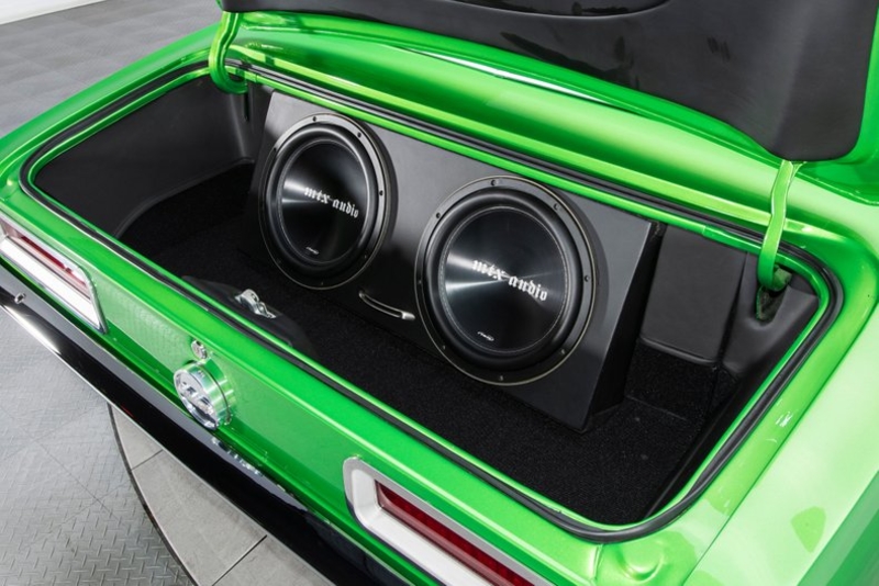 Swing the doors and you'll find a heavily customized interior that wraps classic style in cool comfort and modern convenience. Jet Black leather seats appear to have seen very minimal use. In front of those perches, a custom dash frames clean Auto Meter American Muscle telemetry next to Vintage Air climate control. At the base of that dash, a custom, full-length console centers a traditional Hurst shifter between switches for the car's power windows and modern Sony audio. Custom side panels and premium carpet join upgraded foot pedals and Marquez Design jamb hardware to add both form and function. In front of the driver, a Billet Specialties Rat Tail steering wheel spins a half-wrapped rim around a polished and tilting column. And behind the passengers, a custom-upholstered trunk frames massive MTX Audio subwoofers.