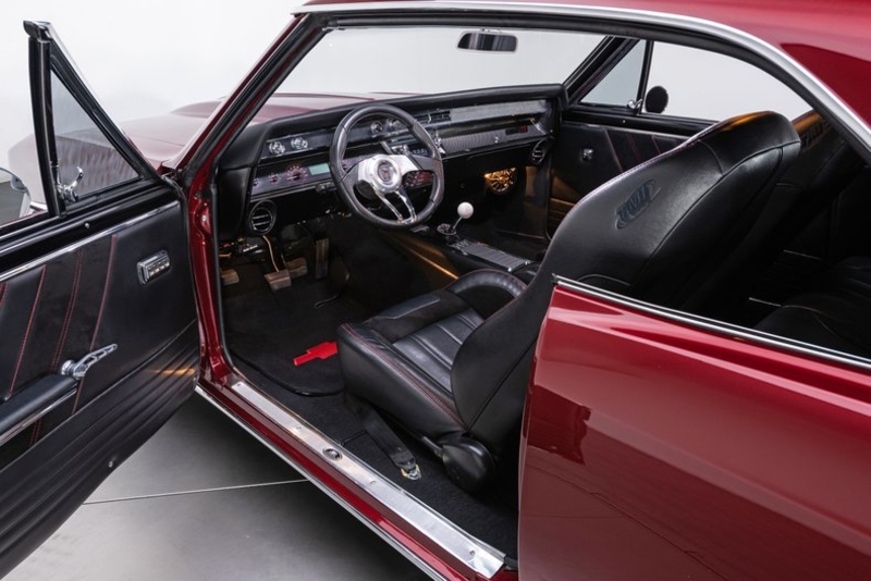 A fully sorted gem that was built by Raleigh, North Carolina's B-Mac's Auto Restoration, this Chevelle is a frame-off, rotisserie restored cruiser that rang up a hefty 6-figure build budget before even accounting for labor and assembly. That precise reboot included solid sheetmetal and sophisticated Corvette Long Beach Red Metallic Tintcoat. And that trick paint, layering both the inside and outside of the car's long body, highlights stellar build quality that's detailed all the way down to new seals, new bolts, and all-new lighting and lenses.