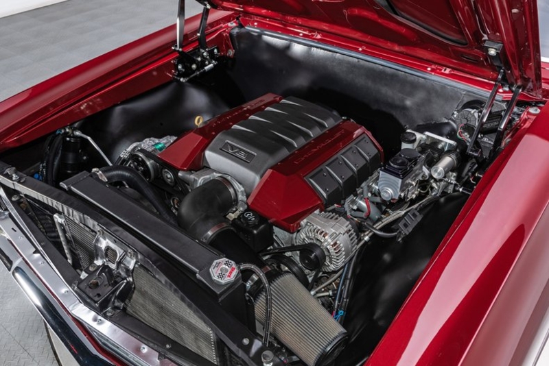 Sourced directly from Chevrolet Performance, this classic's proven LS3 utilizes a hearty 6.2 liters of displacement to turn 409 dyno-proven horsepower into of 404 lb./ft. of dyno-proven torque! At the top of the aluminum mill, a remote K&N filter funnels wind into a trusty GM throttle body with the help of quality Speartech engine management. That bowl is seated on a lightweight composite intake that's juiced by a stainless Rick's VaporWorx tank and GM electronic fuel injection. That air/fuel mixture progresses to rectangular-port L92-style heads, which tuck nicely between fresh MSD plug wires and a color-keyed, fifth-generation Camaro engine shroud. A nodular crank, powdered connecting rods and hypereutectic pistons provide compression, while a hydraulic roller cam maximizes intake efficiency. Speaking of breathing, the smooth mill funnels spent gases through coated Flowmaster tubes. A muted AFCO LS radiator fronts quick-spinning SPAL puller fans. A modern serpentine drive spins modern air conditioning above modern power steering. And items like a smoothed firewall, braided fluid lines, a requisite Holley oil pan and billet Ringbrothers hood supports convey a sense of top-notch detailing.