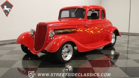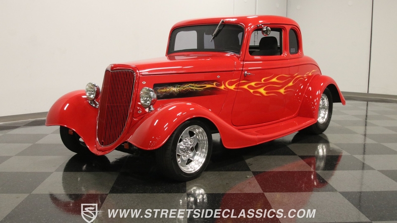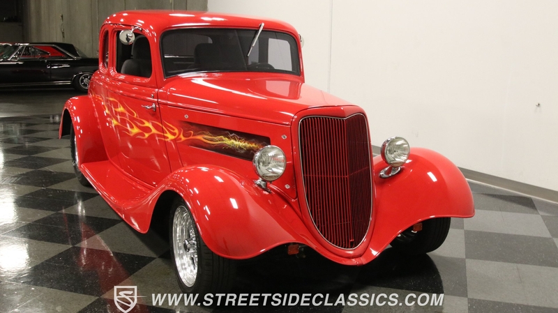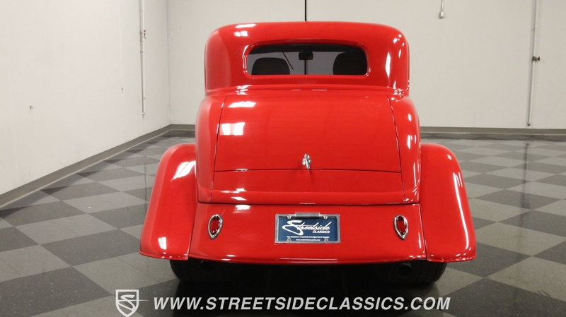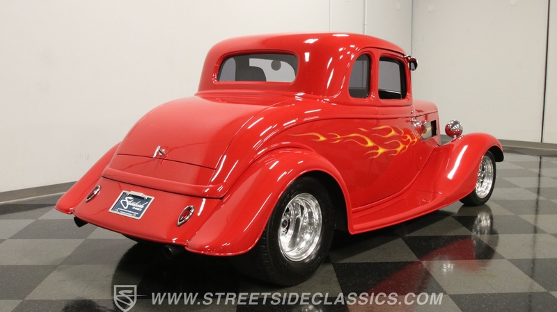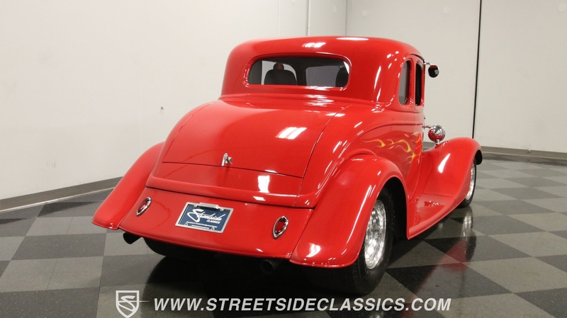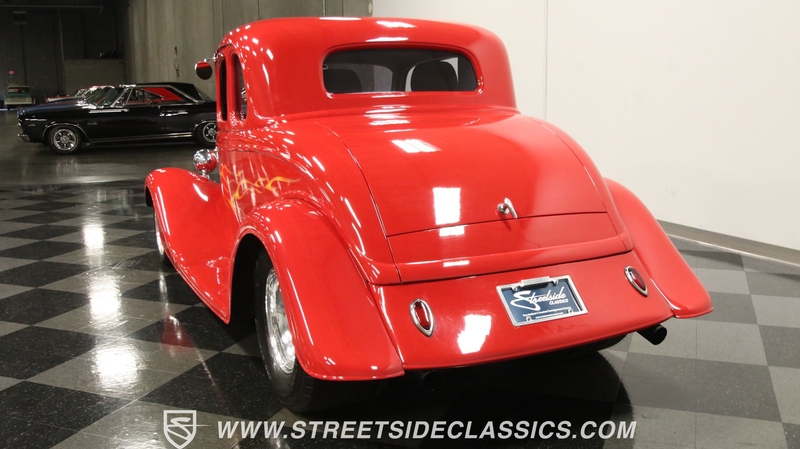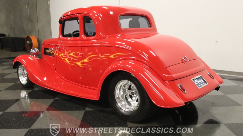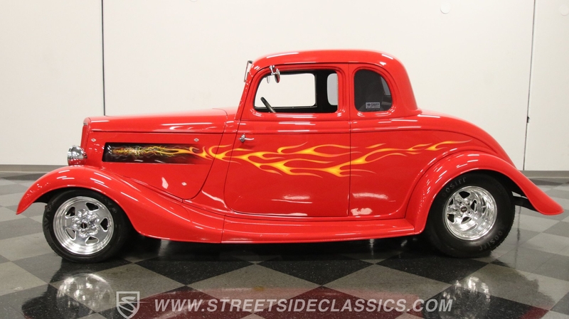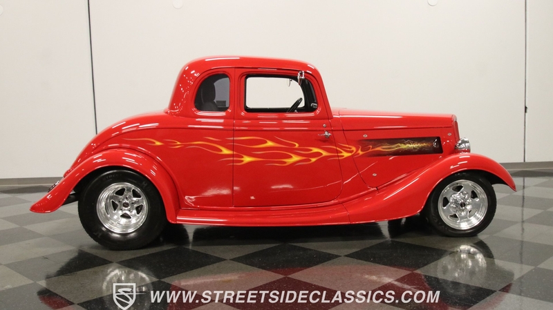 This build starts with some nice fundamental appeal. This is mainly a steel coupe with a metal body, doors, and trunk lid. There's even an original 34' grille. Fiberglass is used to unite the more curvy elements and incorporate modern additions in places like the fenders, running boards, and tail pan. This build was completed around 2004. That doesn't feel too long ago to some of us, and it certainly looks that way when you see the condition of the paint. You can tell they took their time applying the bright red. And so this has a glossy finish that highlights the iconic lines. The coupe forgoes some chrome in the usual places with deleted bumpers and color-matching the grille. We think it makes for a cleaner appearance where you can really see the painted yellow flames along the profile which gives it a street machine level of style. More of this can be seen in the details like the large dual exhaust tips, classic Weld racing wheels, and meatier rear tires that have a terrific stance. Good glass, clear lights, and nice seals make for good fundamentals. It all makes for the kind of coupe that has been given upgrades so that you can enjoy the drive and capture everyone's attention/admiration at the stoplights.