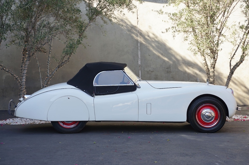 General description : 1954 Jaguar XK120 RoadsterThe 1954 Jaguar XK120 Roadster featured here with matching numbers is available in Old English White with a red interior. It comes equipped with a 4-speed manual transmission, dual carburetors, soft top, side curtains, Tonneau cover, and solid wheels. This Jaguar XK120 has just come out of long-term ownership and is mechanically sound. For $84,500