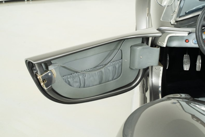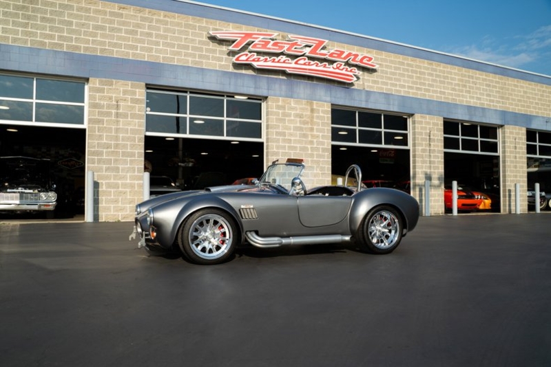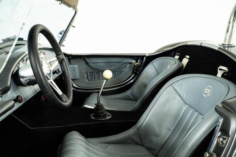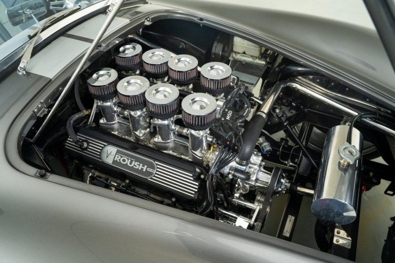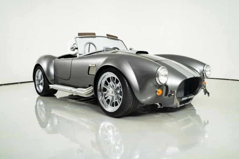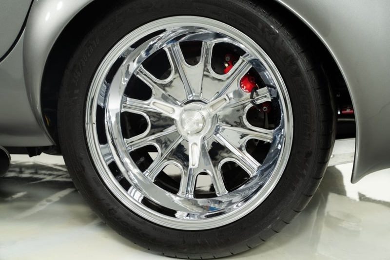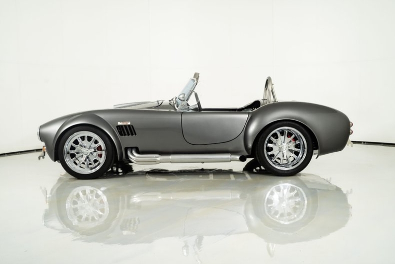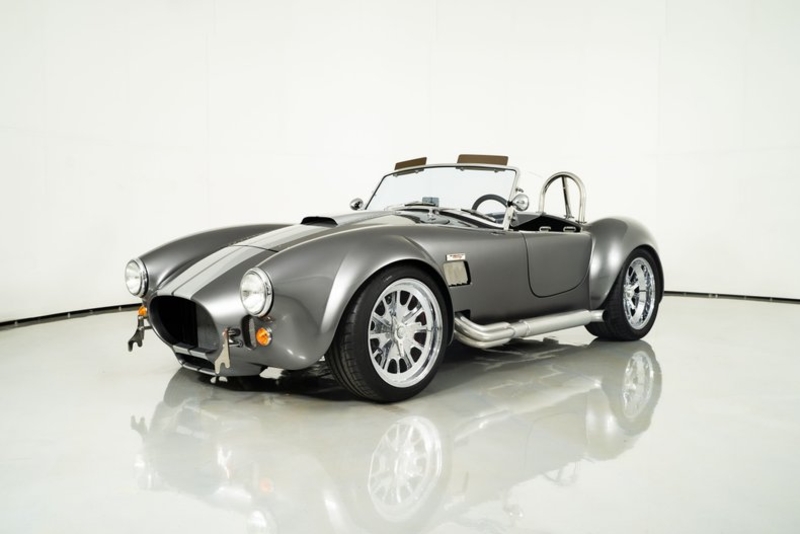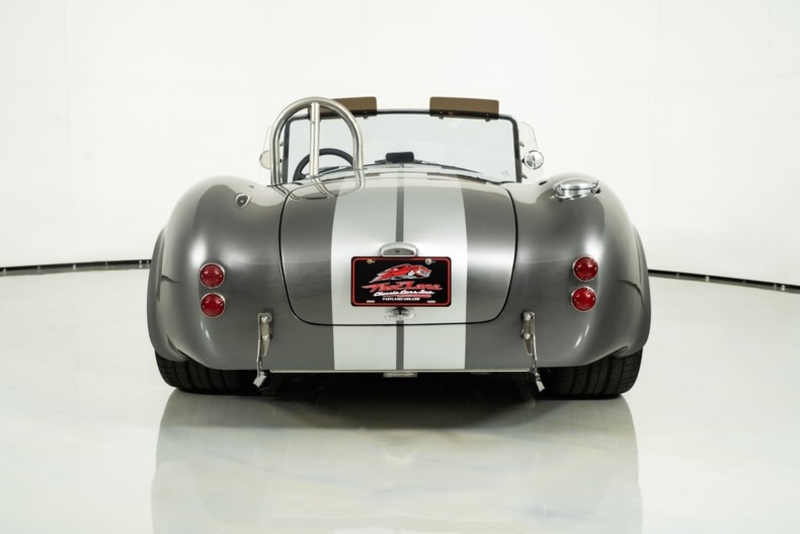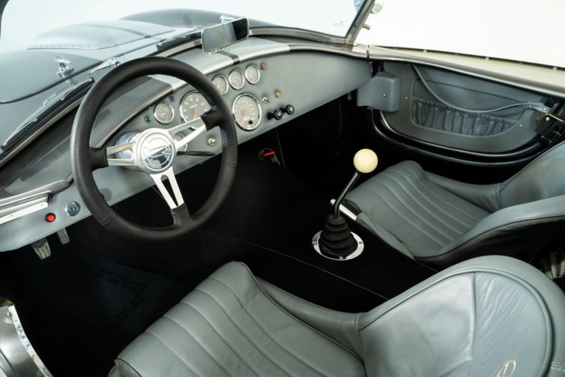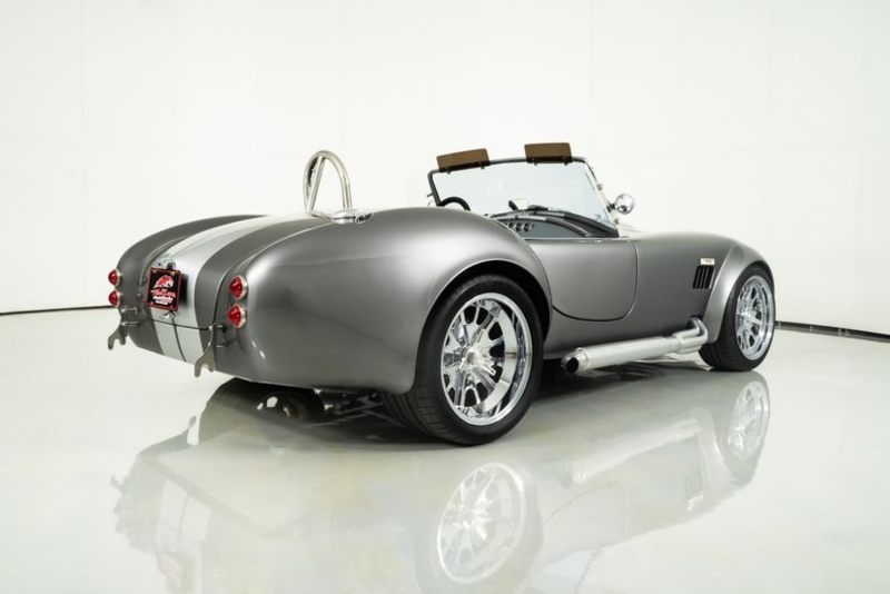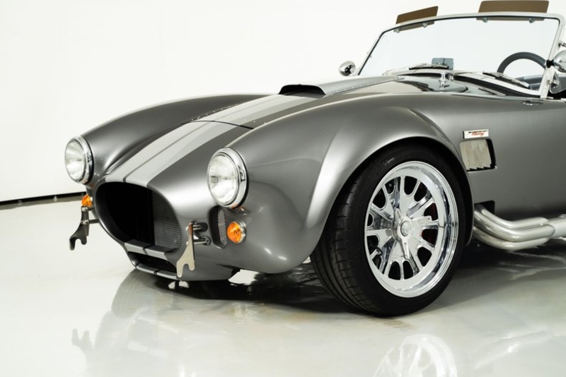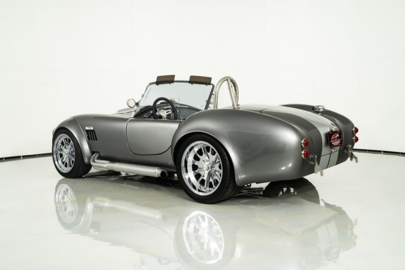 This 1965 Backdraft Cobra for sale has a Roush 427 V8 w/ 560 HP & 540 TQ, 5-Speed Tremec Transmission, Sterling Gray with Silver Racing Stripes, 4-Wheel Power Wilwood Brakes, Independent Rear Suspension, Gray Leather Bucket Seat Interior, Gray Dash and Door Panels, Dual Side Mirrors, Chrome Roll Bar & VDO Gauges, 18” Chrome Halibrand Style Wheels w/ Michelin Tires, Only 1,100 Original Miles!