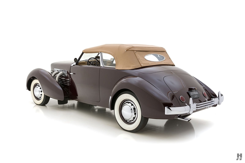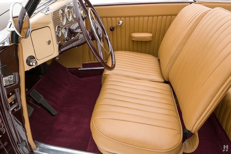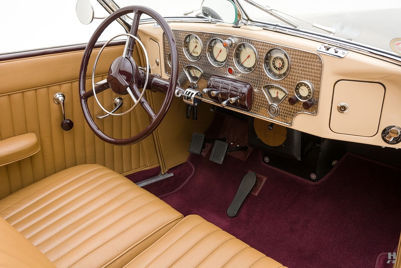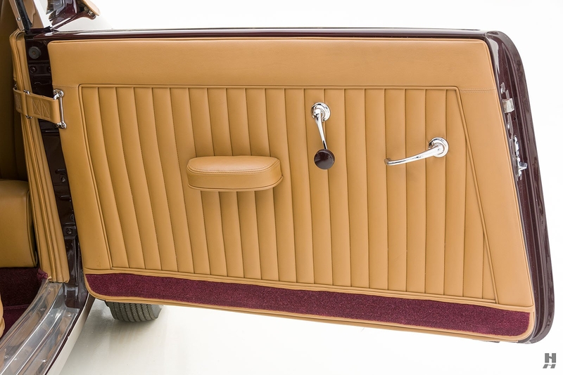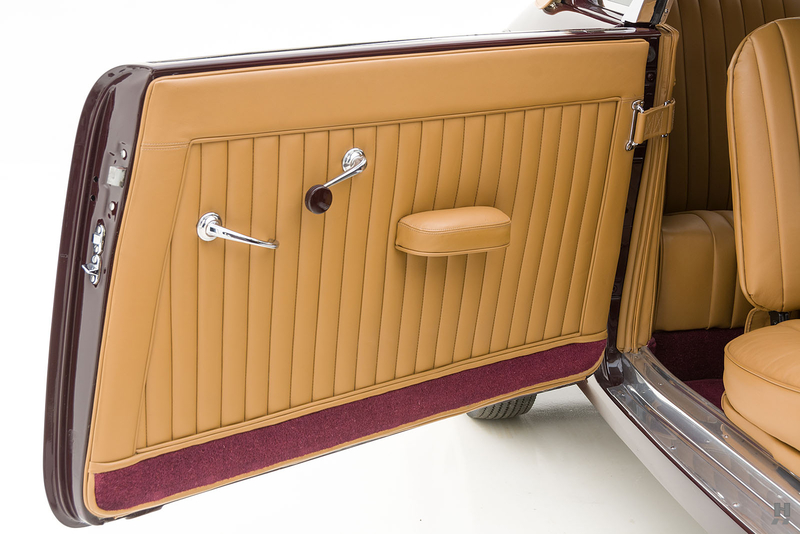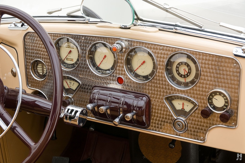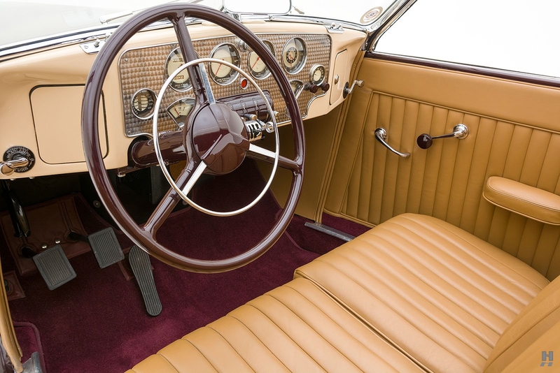 Finally, in 2003, then-owner Tim Whited entrusted Cole’s Classics & Antique Autos of Nederland, Colorado, to perform a comprehensive, nut-and-bolt restoration to concours standards. The Cord was meticulously stripped down to bare metal and restored in its original colors of Rich Maroon over tan leather upholstery and a tan top. The restorers paid considerable attention to details and accuracy, resulting in one of the finest 812 Phaeton’s we’ve had the pleasure to offer. Particularly striking is this car’s beautifully finished interior. The tan leather is offset by maroon carpets and steering wheel, with a contrasting cream dash. The aircraft-inspired instrument panel is a highlight of any Cord cockpit, with an array of instruments and switches laid out in a central engine-turned inlay.