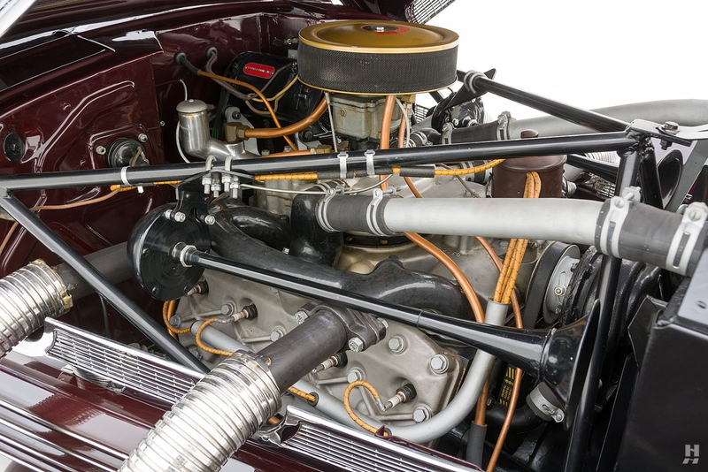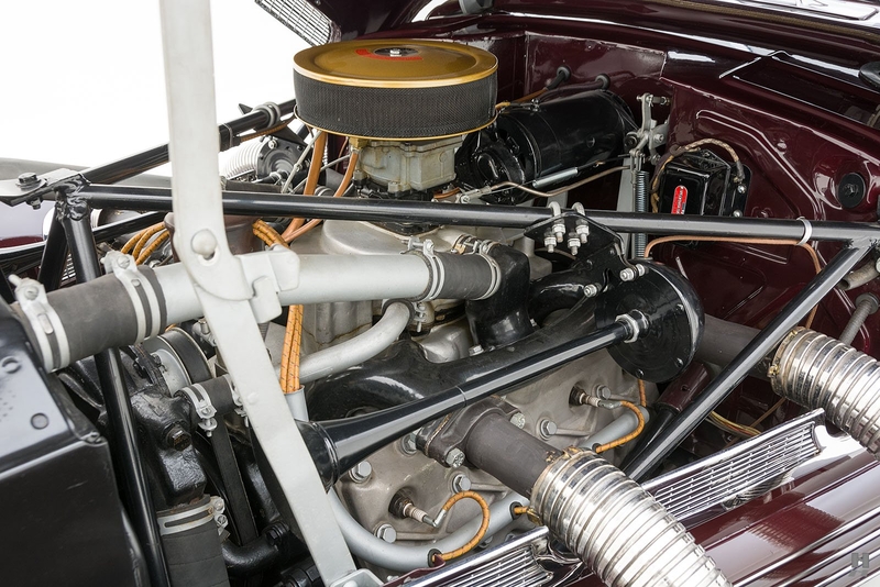 As confirmed by the ACD Club’s Certification program, this is a genuine supercharged Phaeton. It is noted in Josh Malks’ definitive reference, The Cord Complete, that the engine is a “factory replacement” fitted by the ACD company of Auburn early in the car’s life. The Lycoming-sourced V8 engine is beautifully detailed with authentic fittings, hardware, and details, and it runs well. The L-head V8 feeds the front wheels via a four-speed pre-selector gearbox, operated by the marvelously delicate H-pattern switch.