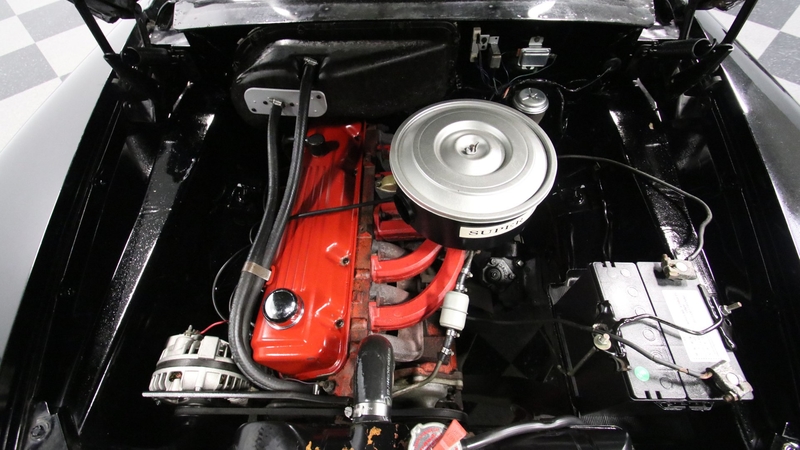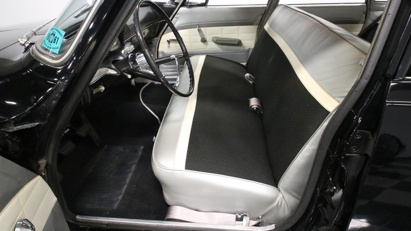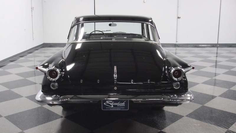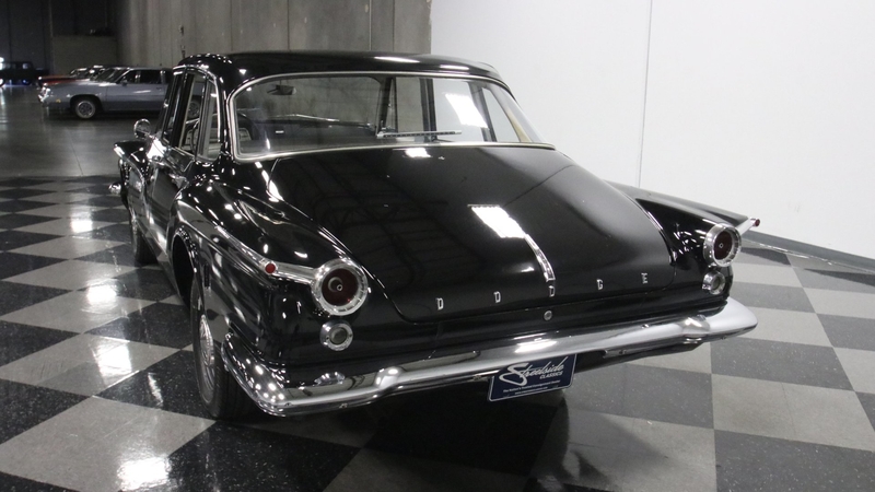 The upper-level 770 model meant a nicer interior, and the so a tasteful white and silver join the exterior-matching black for a great factory-style look inside. This was a compact car by 1960s standards, but today that means plenty of room for family and friends across two wide benches. So while everything looks quite correct, items like the seat covers and carpeting were likely updated later in life just to keep this car a more comfortable cruiser for everyone. And the best seat always belongs to the driver. This Dodge has an artful look with the factory steering wheel, ornate gauges, and a cool push-button setup for the heat/defrost.