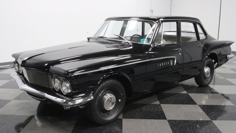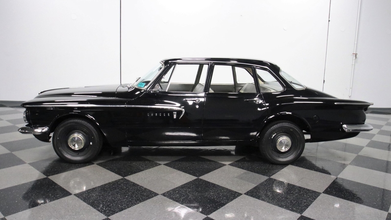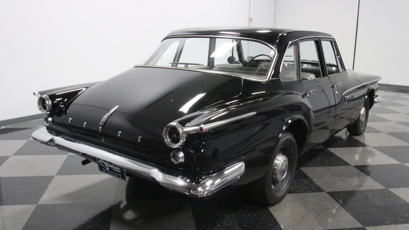 Only on sale for two years, Dodge would get their own version of the Valiant under the Lancer name. So this sedan really helps reinforce that Mopars are often some of the scarcest finds out there. But more than just rarity, when you can get an example like this one, it's time to take notice. The car is one of the most interesting designs of the era with a sharply pointed front end that brings the hood, grille, and bright bumper to the same aggressive tip. The front fender has an artful line that extends into the front doors, and the bright trim really highlights this streak. And those distinct wraparound tailfins give this compact an extended profile. You can see it all so well because the panels are quite straight on a car that's believed to be a well-respected survivor. Even the correct Midnight Black paint is suspected to be original. It has an aged-in appearance, and so factory or not, the look will have people talking about a cool survivor without you having to say a word.
