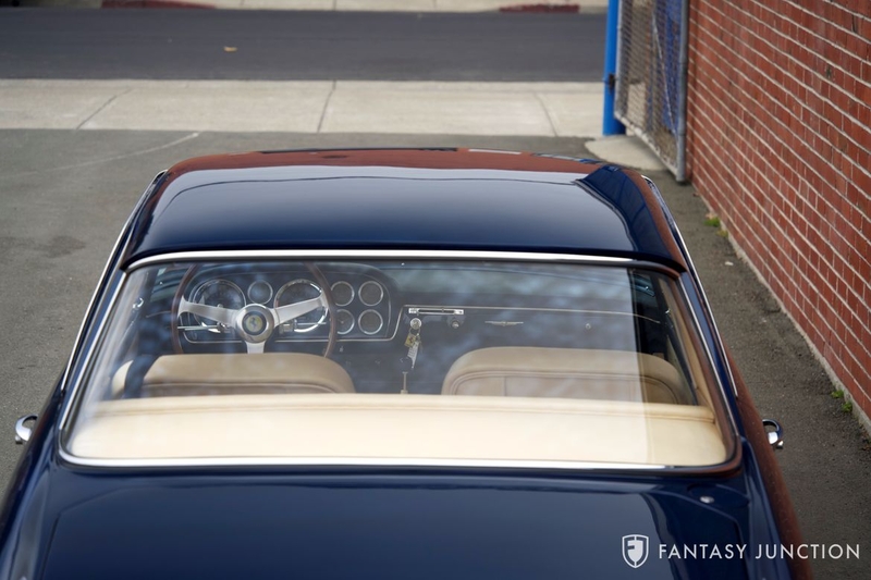 Today this Ferrari presents as a beautiful example of one of the last four-wheel disc brake Series II Coupes built. The exterior finish is beautifully executed with glossy and vibrant paint, having been professionally finished in the correct original Blue Sera color just as it left the factory. The fine body details, delicate body lines, subtle curves, and exquisite surface transitions are expertly finished in both the body work and paint. The doors, hood, and trunk gaps are excellent, opening and closing smoothly. A Viracon tinted windshield shows minor delamination at the corners, but the remaining glass is original and in excellent condition with one minor mark noted at the top of the rear window. The chrome plating, Marchal headlamps, lenses, glass, and trim are consistent and correct. Ferrari script, emblems, and other details are delightful, jeweled elements, adding an elegant touch to the sporting Pinin Farina design. The intricately laced Borrani wire wheels feature correct polished aluminum rims, chrome plated knockoffs, and disc brakes visible at all four corners. A pair of driving lamps are hidden at each corner of the wide grille. Centered by the sculpted Prancing Horse, the lighting is framed by the quintessential polished aluminum Ferrari grill surround and geometric slats. The stately presence is remarkably modern given that more than 60 years has passed since original factory construction.