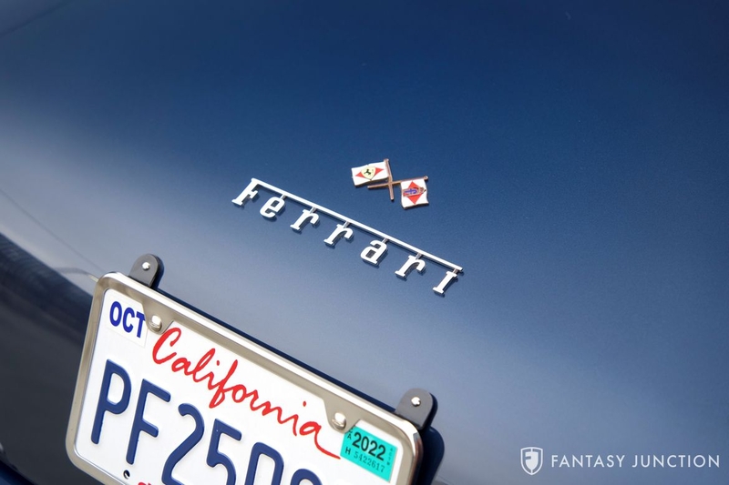 During the restoration, the current owner, an avid Ferrari enthusiast with award-winning restoration skills, engaged top tier professionals and suppliers for parts, specialized services, and correct components. The 2” thick file of restoration records includes invoices from Maranello Classic Parts, GTO Engineering, Re-Originals, G.T. Car Parts, Crosthwaite & Gardiner Ltd, C.Obert & Co., Cicognani, and Sherm’s Custom Plating, to name a few of these well-known companies. Under prior ownership the car had been stripped to bare metal and painted red. This prior paint work was fully removed in all areas, the body was cleaned, primed, and then properly finished in the correct Ferrari factory color Blu Sera. Careful inspection before primer and paint revealed no accident damage. The trunk floor was removed and replaced, and minor rust in the floor outriggers was carefully removed with repairs properly welded into the factory steel sections. The former owner had already reupholstered the interior and safely stored the finished parts. These leather trimmed pieces were installed along with a new headliner and new carpets. The original chrome plated interior pieces were polished and reinstalled and the steering wheel was refinished to a very high standard. Remarkably, the original gauges remained in such excellent condition, they simply needed to be cleaned, polished, and tested for function. All gauges function with the exception of the clock which needs to be cleaned and relubricated.