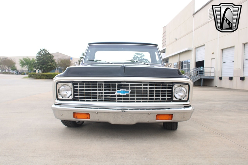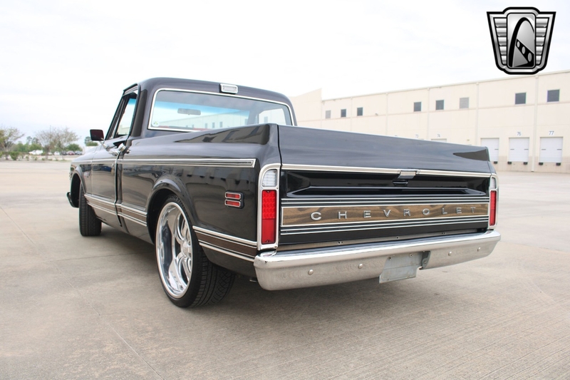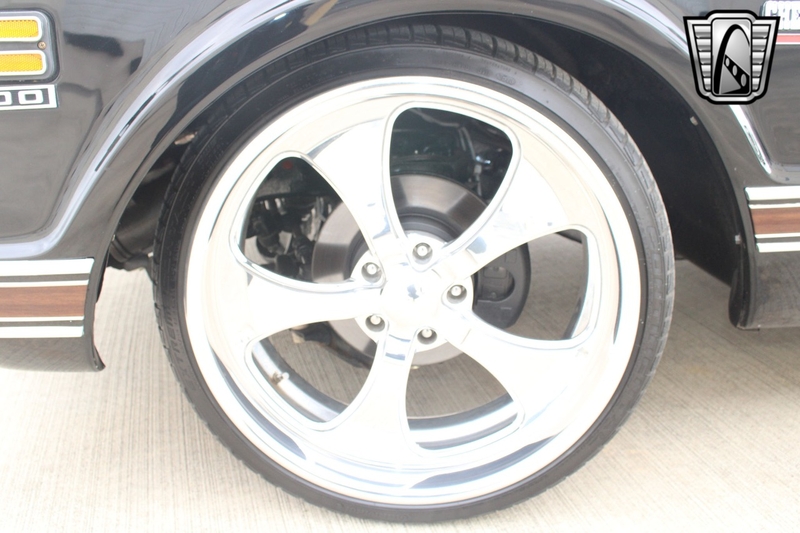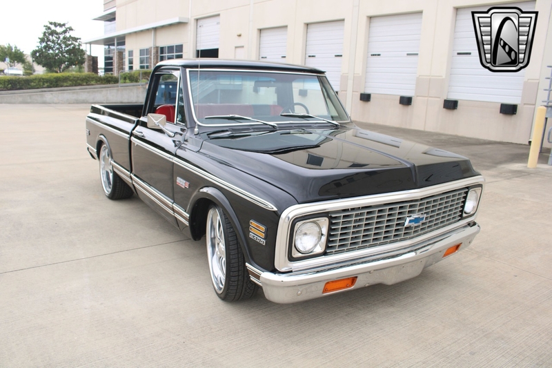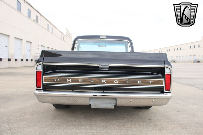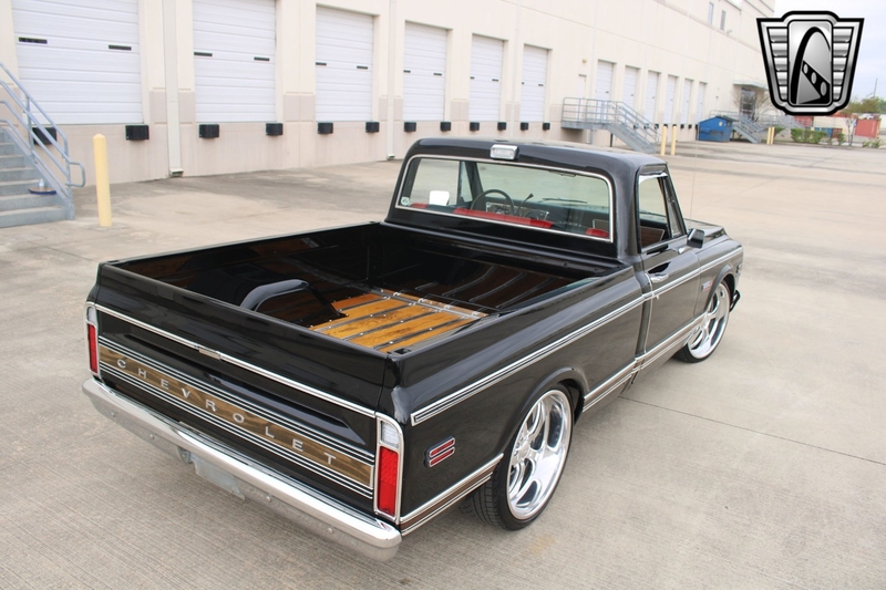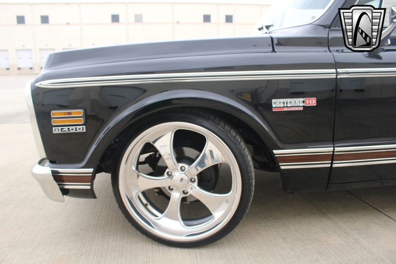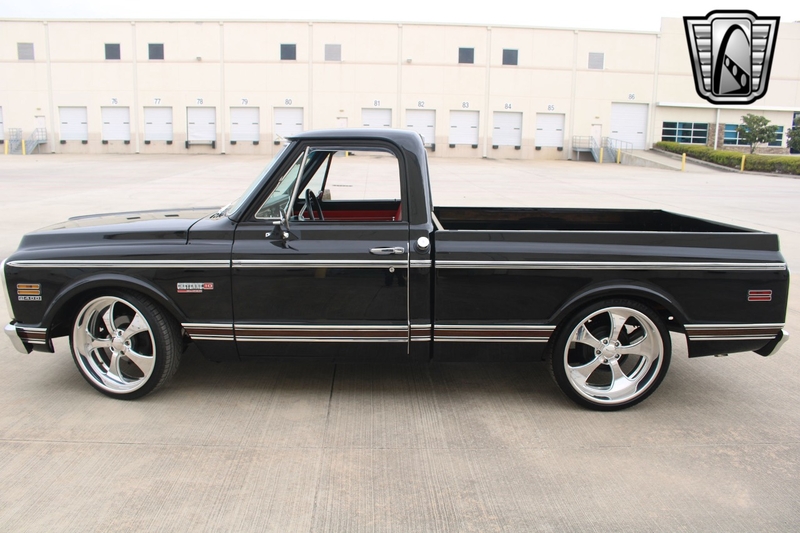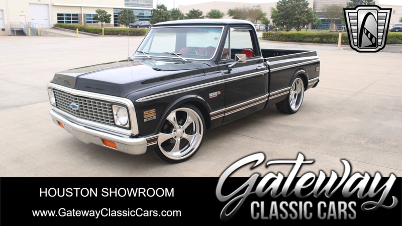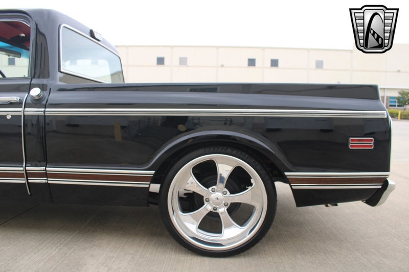 Description : Gateway Classic Cars Houston Showroom is proud to present this sleek black 1972 C10 Cheyenne Super. Being one of the premium trim packages one could get, this C10 shows the true beauty of the square body generation. The chrome that is wrapped around this black beauty pairs nicely with the custom 22inch chrome rims designed by Schott. To add to the CS Chevy decided to do a woodgrain paneling which adds its own uniqueness and coolness that many other square bodies can't give you. Jump in the cab, and be wowed by an all-new interior, starting with the new red with black accent leather bench seats. The owner decided to replace the door panels keeping the same design as the seats and replaces the headliner with a red leather material. To match the wood panel bed the interior of this C10 has a woodgrain finish that is all across the front dash that bend in with the Custom Dakota gauge cluster. Get to the real goodies in this truck and it lies beneath the hood of this beast. Sporting a 396 CID V8 that was rebuilt by Dooley's and Sons Hot Rod Shop out of Magnolia, Tx. When rebuilding the engine, the owner decided to have the 700R4 rebuilt, since both, the engine and the transmission rebuilds, the truck has a total of 725 miles on her. Sitting on that might 396 is a 4-barrel Holly carburetor. The engine has been fitted with chrome Edelbrock headers, along with a serpentine belt system. To cool this big beast this C10 has been equipped with an aluminum dual fan radiator. When it comes to Chevy C10 square bodies, it will be hard to find one in which beats the style, sleekness, and quality of a build like this. So come add this C10 CS to your collection today before some other lucky soul does.