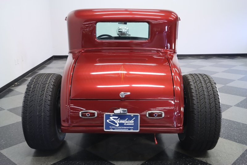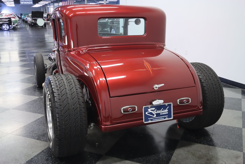 This custom build has a mean stance that combines the original hot rod spirit with a bit more modern touches. This coupe is a desirable steel body! And the Black Cherry Wine has a hint of modern metallic that will have you taking this one out on every sunny Sunday. Of course, a proper 5-window coupe needs all the right classic pieces, too. That's why you have the bright waterfall grille, a windshield overhang, blue dot taillights, and proper drag wheels. And the full pinstriping package gives this the look of a hot flame-kissed custom.