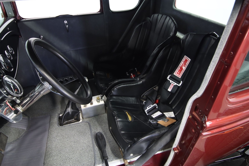 The interior has a very clean setup that continues this hot rod's high-performance attitude. You have proper racing seats, vintage racing belts, and even a roll bar for added strength. You get a grippy sports steering wheel on a polished column, a Hurst floor shifter, and the dash is dominated by your full gauge package.