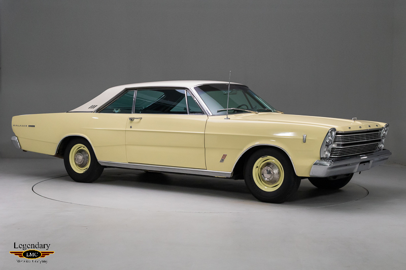 In 1966, only 237 R-Code Galaxie 500s were built, marking this as an incredibly rare high-performance machine that represents everything that was right with the Blue Oval in the 1960s.This car was assembled at Ford's Twin Cities plant near Minneapolis/St. Paul, Minnesota during the first week of October 1965. In addition to having the R-code 427 V8, it was also one of very few 1966 Ford's that received a two-tone paint scheme with the lower body painted Springtime Yellow and the roof finished in Corinthian White. The interior of the car features full-width bench seats in a the optionally available specially embossed black vinyl seat coverings, black loop pile nylon carpeting and other appointments in black. Under the hood the rests 427 engine, ready to serve up a mix of premium fuel and air, with a pair of thirsty Holley four-barrel carbs. Those carburetors are protected by that large aluminum oval air filter housing decorated with the spread-wing 427 emblem at the front. You can look but you won't see any horsepower robbing accessories under this hood, only a pair of imposing cast-iron headers. There are a couple of creature comforts like tinted glass all around, Magic-Aire heating and defrost system, and a factory AM-FM push-button radio—still quite a novelty on 1966. The wheels are adorned with the basic "dog-dish" hubcap and the car is riding period correct Firestone 7.10X15 "Gum-Dipped" blackwall tires.