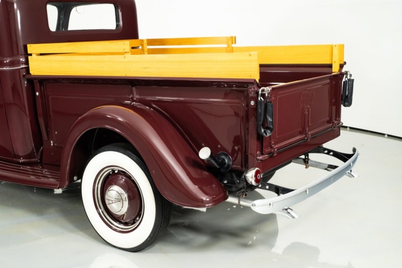 This 1937 Ford Pickup for sale has a 255c.i. Mercury Flat Head V8, Upgraded 4bbl Carb, 3 Speed Manual Transmission, All Steel Body and Steel Fenders, New Wood Slats and Bed Rails, Two Tone Vinyl Interior, Dual Side Mirrors, Seat Belts, New Vintage Style Gauges, Dual Exhaust, New Front and Rear Bumpers, Updated Polished Offenhauser Intake, Painted Offenhauser Heads, 16” Painted Steel Wheels w/ Ford Hubcaps and Trim Rings, Wide White Wall Tires, Flat Head V8 Powered Ford Pickup!