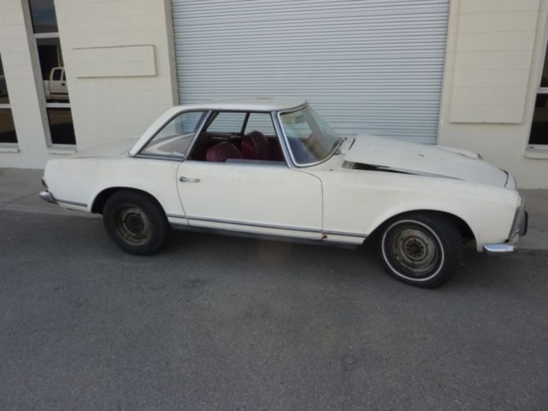 1965 Mercedes Benz 230 SL Roadster , weiss / Rot Interior , wurde ein 1968 MBZ 230 / 8 Motor eingebaut # 180 954 10 xxxxx , laeuft und faehrt , Wagen hatt rost im Unterboden vorne , Kofferaumboden sollte gewechselt werden , kein Sofdtop , sehr gute Euro - Scheinwerfer , auf grund des zustandes wird der Wagen als Bastler Auto verkauft . .