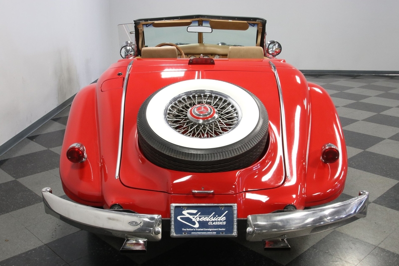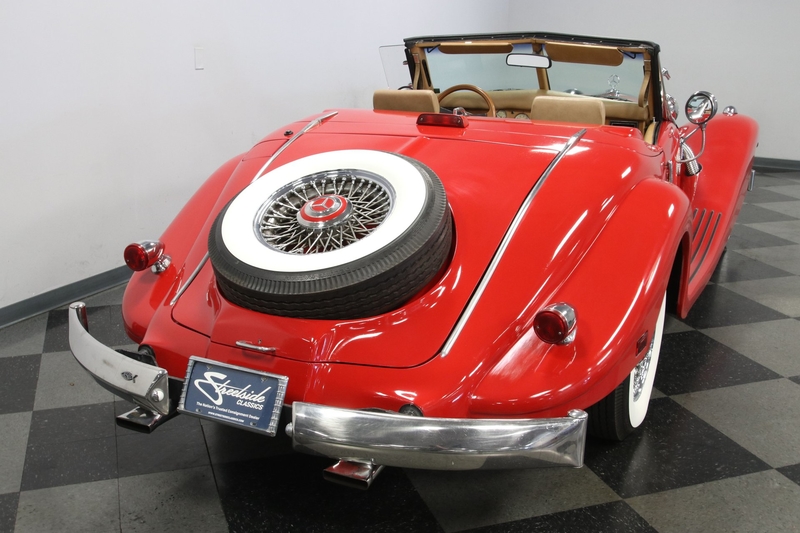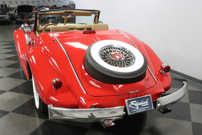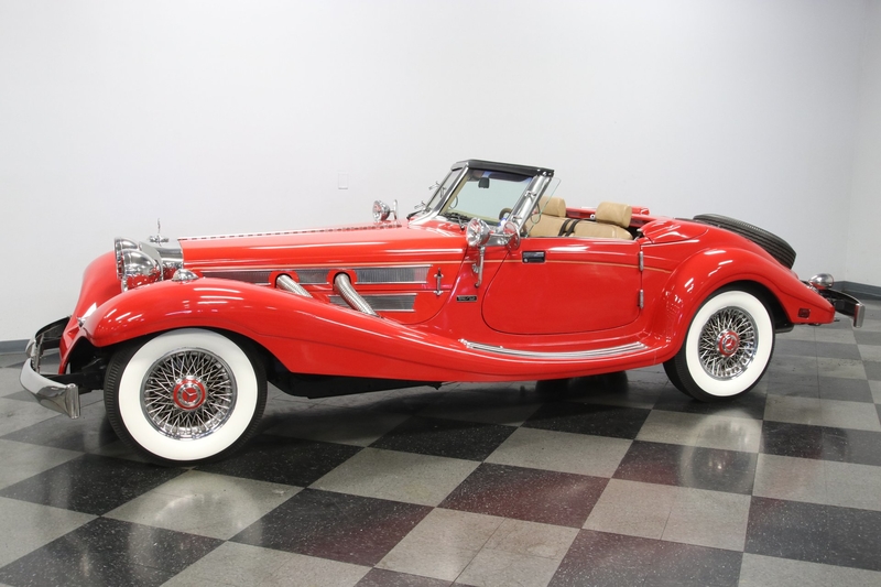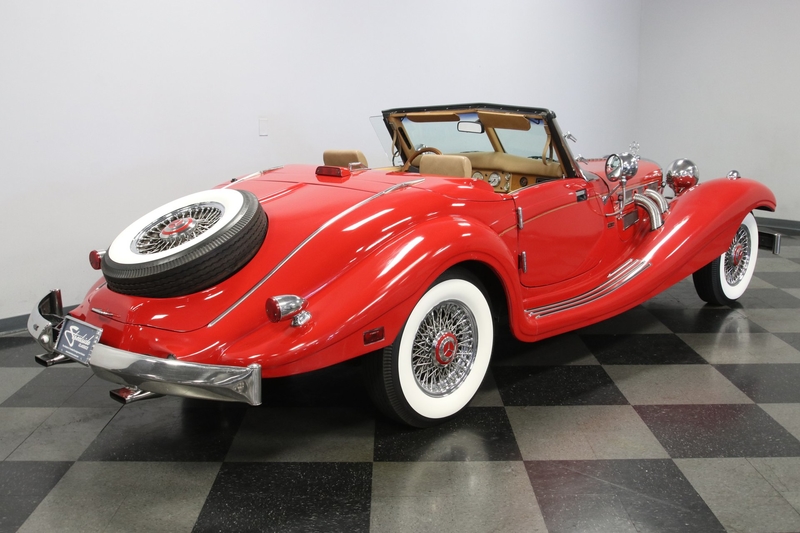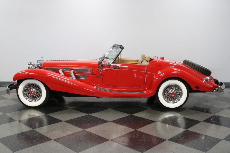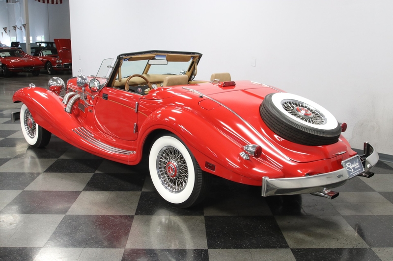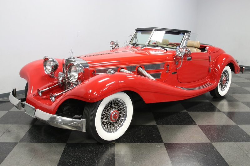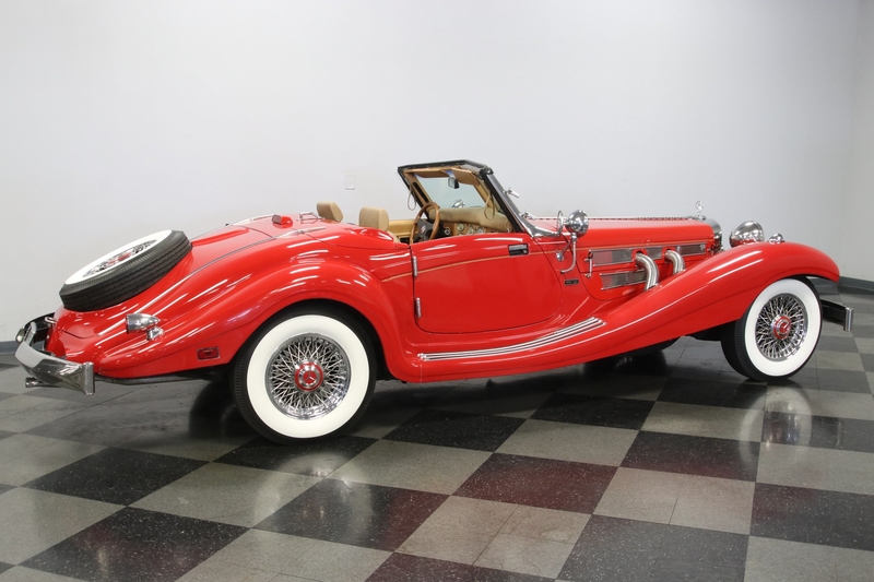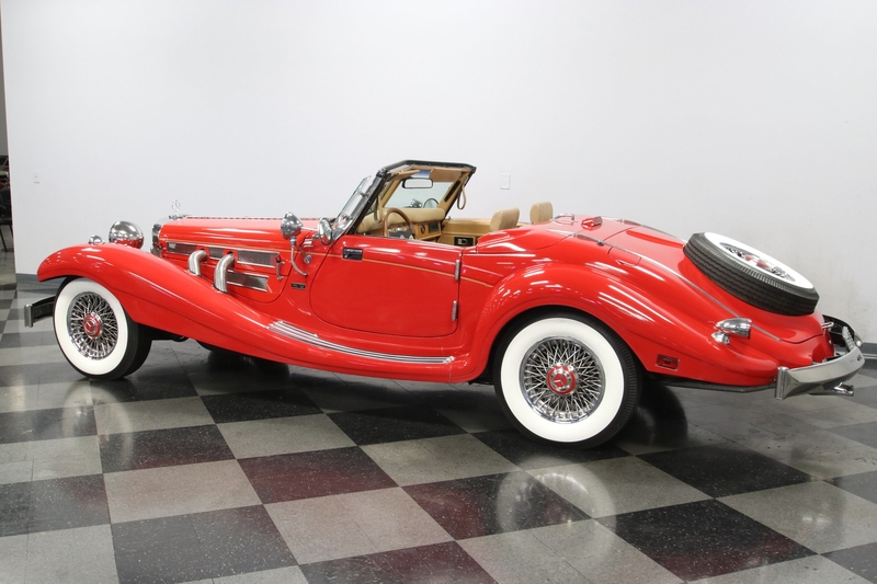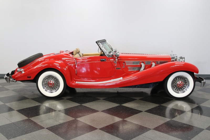 The reason why the Mercedes 500K is such a coveted classic is because it's one of the most beautiful designs to ever hit the road. And so it's great to see a fiberglass replica that takes the time to get the look right. The proportions are quite correct, so you get that extra-long hood that allows the flowing fenders to fully develop those million-dollar lines. Red is always a desirable color because it can attract extra attention from blocks away, and it makes for a nice backdrop for all the beautiful brightwork details. The hallmark (faux) side exhaust pipes, dual horns, dual spotlights, correct wide dual exhaust tips, and a full-size spare tire on the rear give this distinction from every angle. Occasionally you will find other 500K replicas out there, so it's important to notice how this one provides a clear difference in quality. For example, this has genuine Dayton wire wheels, because after all, nothing quite breaks the spell of an authentic-style vehicle than adding cheap wheel covers. That's why these are even nicely detailed with color-matched tri-star center caps and wide bright whitewall tires. While cars like this were meant for top-down motoring, this one makes sure it's a total package that also is impressive with the roof in place. The folding top utilizes Mercedes fabric for a special design that follows the original 500K silhouette closely. The frame is even chromed. Plus, the bright white coordinates with the wide whitewalls to give this a hint of two-tone appeal when the roof is in place. And if desirable to the new owner, the consingor is offering a hardtop for the car. With slight modification can offer another option for days that you do not want the wind-in-your hair feeling.
