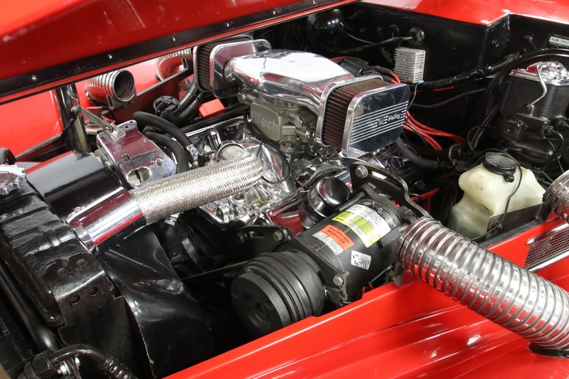 The polished package on the motor ensures you're going to open both sides of this butterfly hood every time you park at the car show. And just like the rest of this car, it has an impressive appearance that also has a practical side. You've got a hardy Chevy 350 cubic-inch crate V8 powering this Mercedes-style vehicle. This was further upgraded with the expensive FI Tech fuel injection system, which is great for both power and consistent delivery as well as a dual exhaust system which not only adds symmetry when looking at the car from the rear but helps with performance and an exquisite exhaust note. It's all part of a car that was made to be a great driver. That's why the front suspension was positioned and adjusted for a more comfortable ride; there are upgraded sway bars front & rear; and you have the superior stopping power of four-wheel power disc brakes.