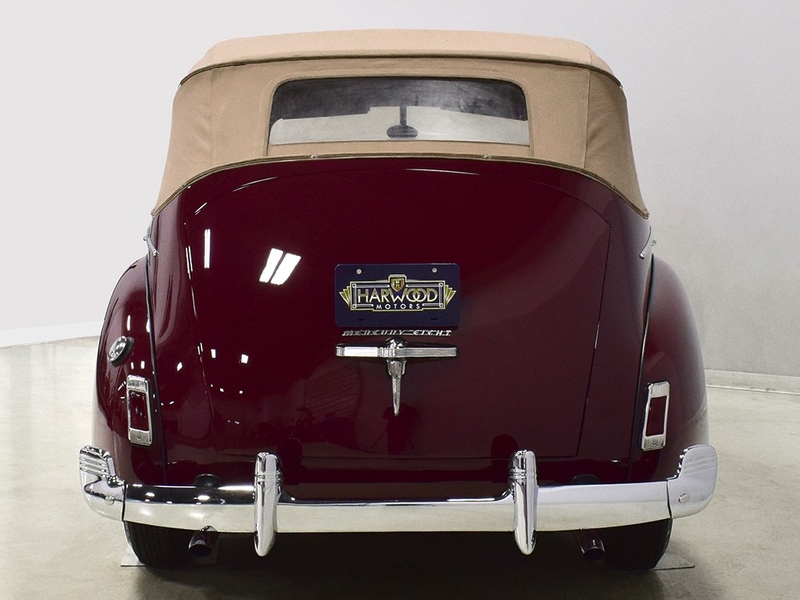 Mercury was only in its second year of production when this beautiful convertible sedan was built. Interestingly, Ford discontinued the convertible sedan in the Ford line, moving it upscale and with an original sticker price of $1212, it was some 20% more expensive than the top-of-the-line Ford. Looking at the styling it’s easy to see both Ford and Lincoln DNA in the Mercury, which was surely the intention—it’s a really pretty car. We don’t know much about who did the restoration beyond the fact that they knew what they were doing. The Ford Maroon paint is deep and lustrous, the bodywork underneath is laser-straight, and all four doors close with precision, which is a real achievement in a 4-door convertible. The fine-toothed grille echoes big brother Lincoln and the chrome is in beautiful condition, as is the rest of the brightwork on the car. Teardtop-shaped headlight housings incorporate parking lights, while the rear deck is adorned with art-deco “MERCURY EIGHT” lettering. Those bumper ends are a very rare accessory and it carries twin door-mounted mirrors for safety in traffic.
