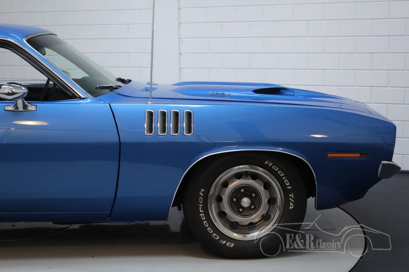 Plymouth Cuda 340 for sale at E&R ClassicsUnlike most Plymouth Cudas, this one has been kept as original as possible during the restoration. No exaggerated modifications, but the beautiful looks of the original have been retained. The Cuda has a beautiful blue paint with black stickers that refer to the powerful 340 CI engine. The distinctive grille, hood scoops and side air vents make it a real eye-catcher. The interior is in a very good condition and is equipped with luxurious seats and dark upholstery. You will not easily come across a more beautiful one.