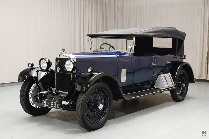 The Sunbeam Talbot Darracq Register indicates that this 14/45 Tourer, chassis number 25065, was originally sold to the delightfully named Maude’s Motor Mart of Exeter, UK. It was ordered on 19 February 1929, invoiced the next day and delivered the following week on 27 February. In previous ownership, it was restored over an extended period from the 1970s until 1996. Its original registration, RL 9317, a 1929 Cornwall issue, remains with the car. Wearing five-seat open coachwork from Darracq Motor Engineering Co., which had been Alexandre Darracq’s aeronautical company during the Great War, this car is the quintessential early British tourer. It is handsomely finished in deep blue with black wings and a black hood and tonneau cover. The body features restrained nickel brightwork which is in very good condition. The paintwork is showing a light and pleasing patina, while still remaining very attractive. Notable period features are direction signals atop the rear number plate, a fishtail exhaust, and leather-gaitered springs.
