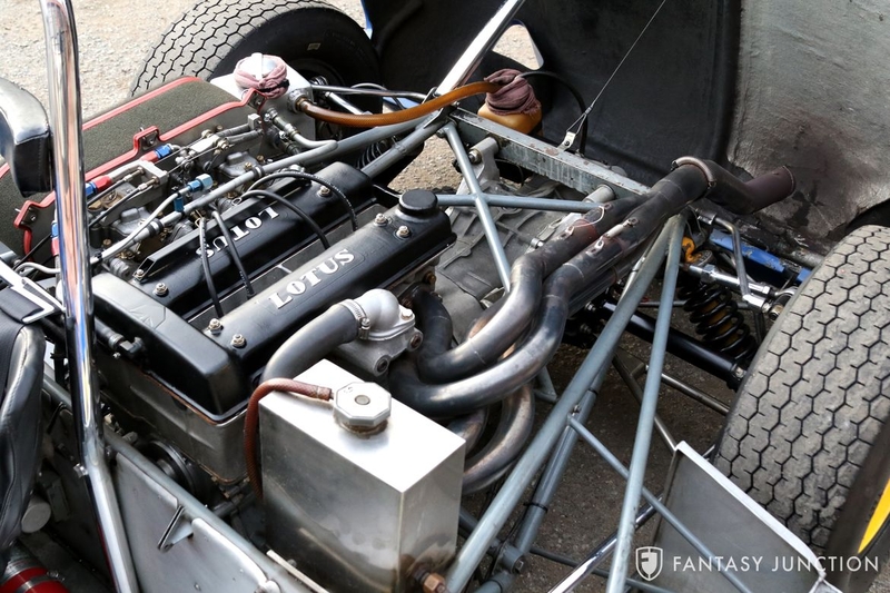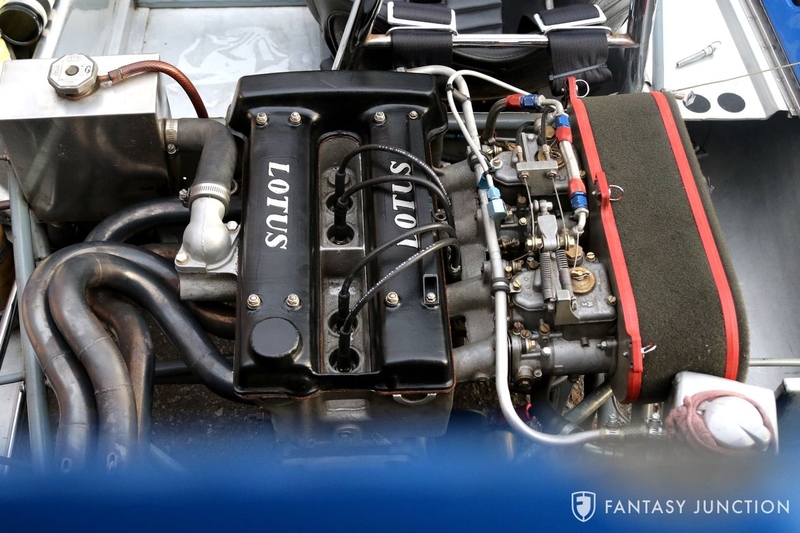 The clean and well-presented lines and finish of the exterior continue to the interior of the car. The cockpit is tidy and properly sorted with correct instrumentation, characteristic painted gray lightened structural steel cowl hoop, and competition five-point harness with seat belts dated to June 2021. The suitably trimmed and contoured black vinyl driver’s seat is surrounded by raw aluminum central-tub construction and hinge-out door panels. The current owner is 6’ tall and reports he fits comfortably in the car. Instrumentation is clear and functional, again in keeping with quality racing cosmetics. Cohesively prepared and properly set up for racing, this Lotus has both the visual presence and mechanical confidence backed by decades of racing.Raising the front section of the car, the brilliant simplicity and effectiveness of Lotus engineering is revealed in the front suspension, frame, and uprights. Interesting details include the radiator, which maintains a numbered and embossed Manchester, London manufacturers plate. Construction techniques and clever engineering verify the mantra of Lotus engineering to “add lightness”. Moving to the rear of the car, the engine and engine compartment further display satisfying cosmetics, featuring robust hardware both for competition confidence and satisfying aesthetic results. The twin cam dry-sump engine breathes through twin dual throat Weber carburetors exhausting through a tuned bundle-of-snakes exhaust, exiting the rear body panel.