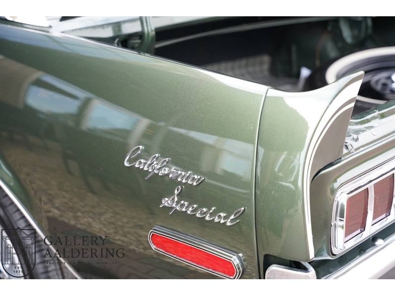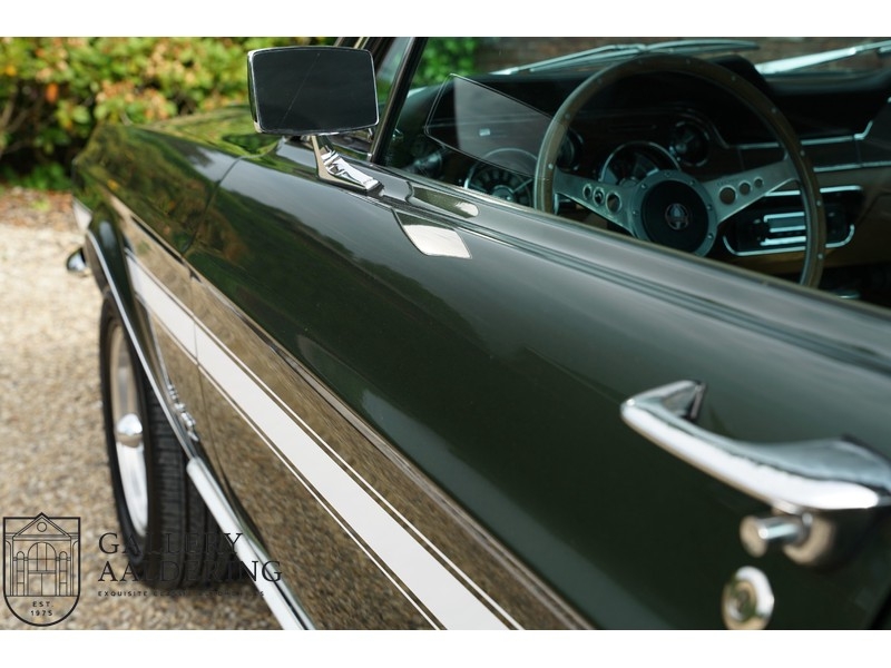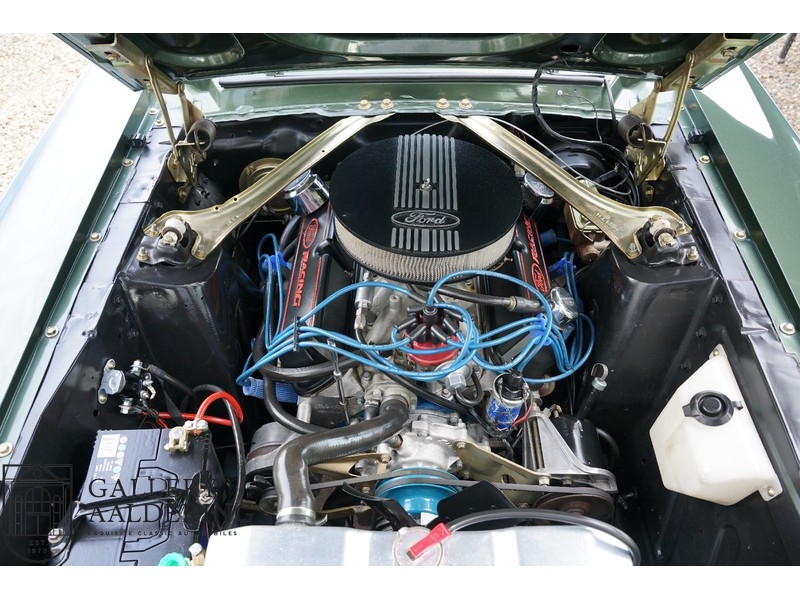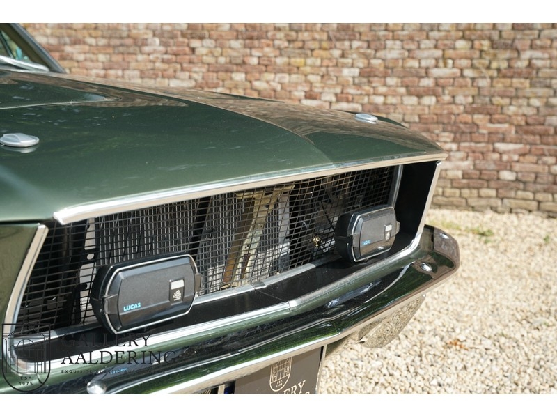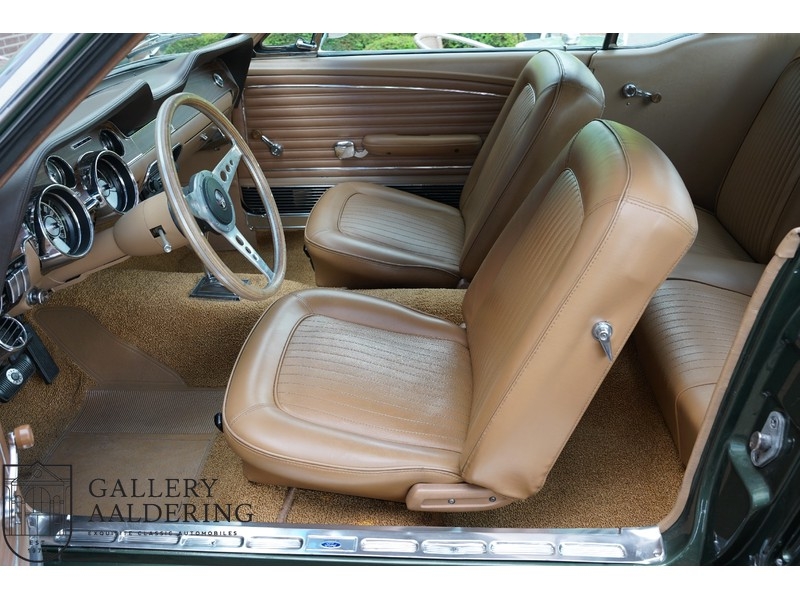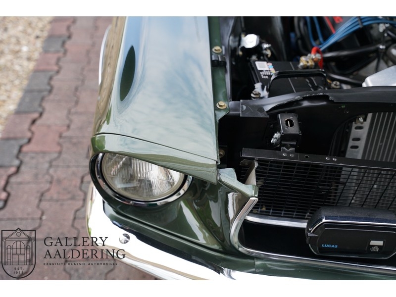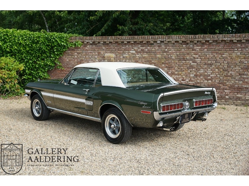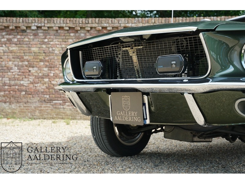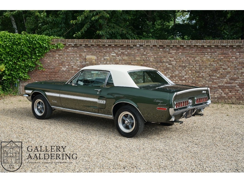 Allmän beskrivning : This must be the colour of choice for any 1968 Ford Mustang, don’t you agree? Known as Highland Green and made famous by Steve McQueen in the Bullit movie. Where he had a Ford Mustang GT fastback in the movie, the one we have is much rarer. Its full title is Ford Mustang GT California Special Hardtop, aka Ford Mustang GT/CS. The Ford Mustang GT/CS was a limited edition only available in 1968. It is an unbelievably cool creature and very rarely seen on European roads. This fine specimen arrived in the Netherlands in 1997. It has a body kit directly sourced from the Ford Mustang Shelby GT. The good looking bodywork is in excellent shape. It has nice and thin, correctly aligned panelwork. The white vinyl roof covering is new and stands out beautifully with the green paintwork and white stickers. The Highland Green paintwork is in excellent condition. The interior trim has been reupholstered in keeping with the original spec. The brown carpets and vinyl seating are in very good shape. The instrument cluster, controls and roof lining have also been properly looked after. The Ford Mustang GT/CS not only looks seriously fast but also shifts swiftly thanks to the GT engineering. This car has a 5.7-litre V8 engine producing 350 Ps through a 3-speed automatic. The. engine delivers a shipload of torque under all circumstances. The engine is also fitted with an Edelbrock inlet manifold, an open-air filter and an aluminium radiator. The good condition of both brakes and suspension means they are more than up to their respective tasks. In short this is not just a fantastic looking Ford Mustang GT/CS but also a car that delivers oodles of joy anytime you take place behind the steering wheel. Gallery Aaldering is Europe’s leading Classic Cars specialist since 1975! Always 400 Classic and Sportscars in stock, please visit http://www.gallery-aaldering.com for the current stock list (all offered cars are available in our showroom) and further information. We are located near the German border, 95 km from Düsseldorf and 90 km from Amsterdam. So easy traveling by plane, train, taxi and car. Transport and worldwide shipping can be arranged. No duties/import costs within Europe. We buy, sell and provide consignment sales (selling on behalf of the owner). We can arrange/provide registration/papers for our German (H-Kennzeichen, TÜV, Fahrzeugbrief, Wertgutachten usw.) and Benelux customers. Gallery Aaldering, Arnhemsestraat 47, 6971 AP Brummen, The Netherlands. Tel: 0031-575-564055. Quality, experience and transparency is what sets us apart. We look forward to welcoming you in our showroom