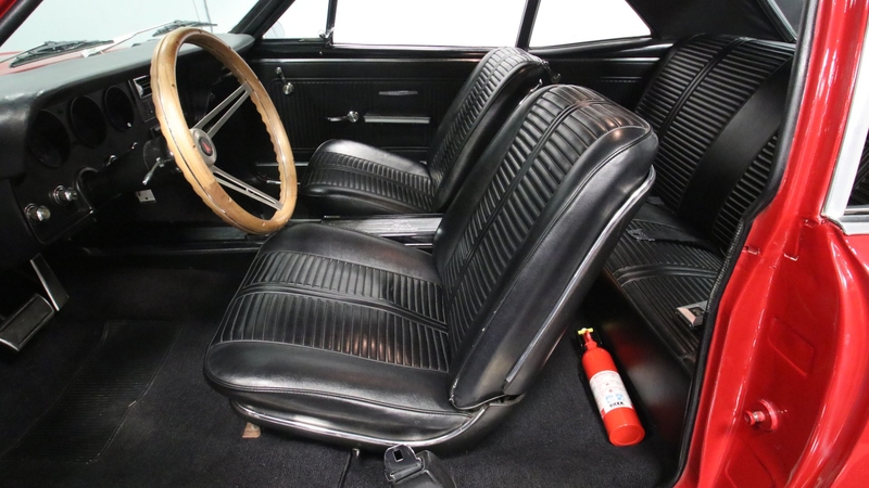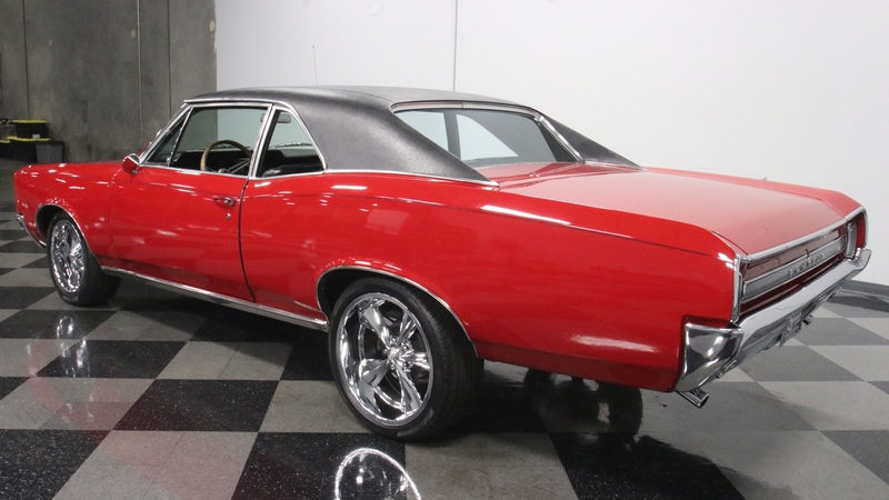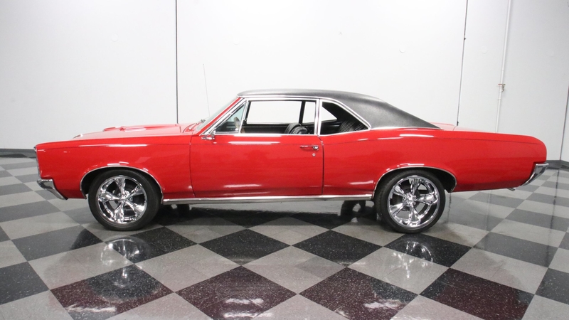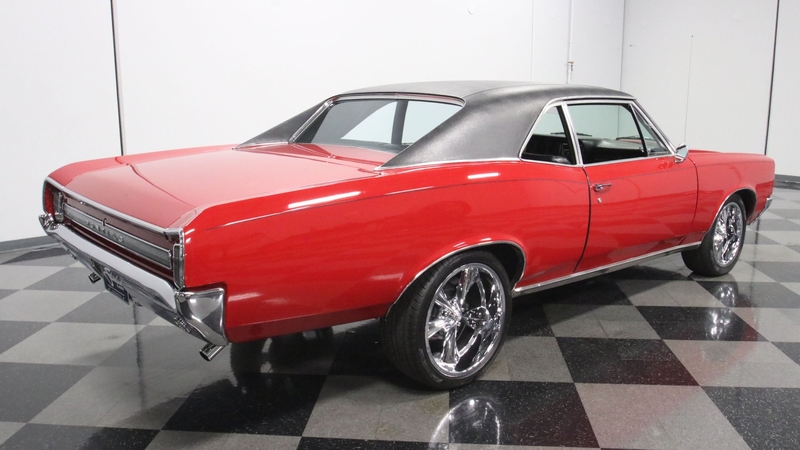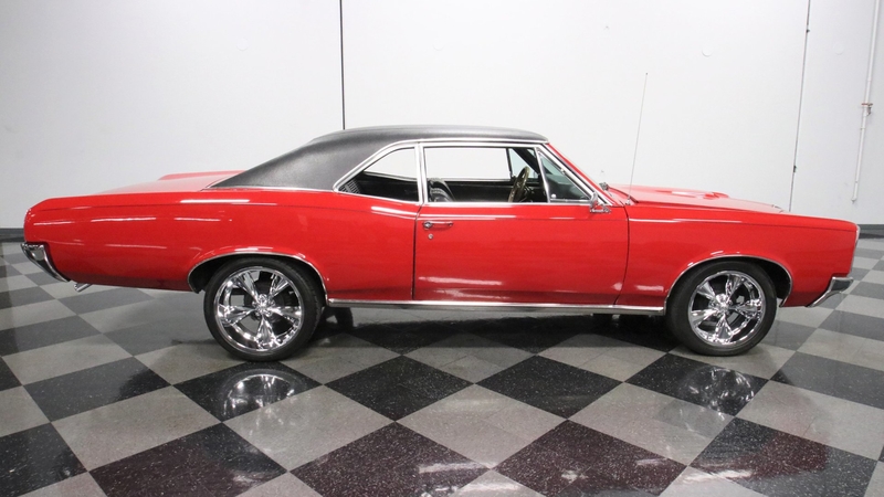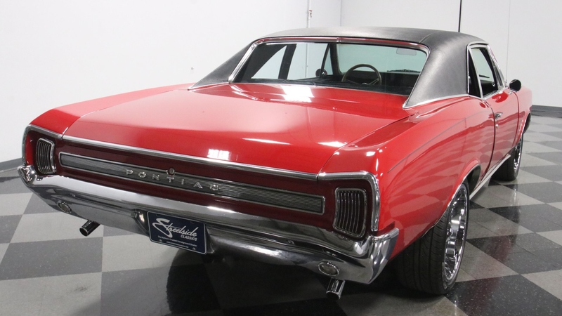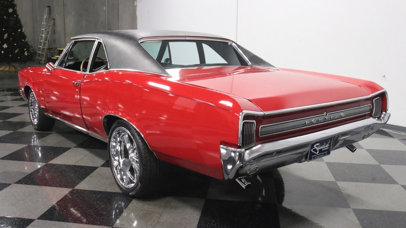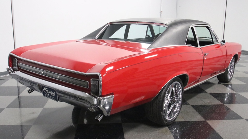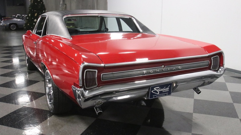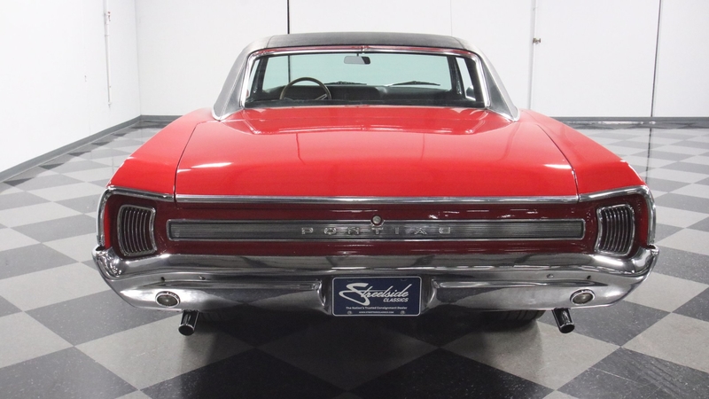 This coupe does a great job in setting both an aggressive and elegant tone. It all starts with the red paint that was an application later in life, and it still retains a good luster that will radiate in sunshine. But it's more than just the color you'll love. 1966 was a great year for Pontiac. The stacked headlights, the broad dual grilles, and the taillight panel that reaches around the fenders are all part of the Wide Track look. There's a premium style here with the black vinyl roof highlighting a hint of flying buttress in the roofline. Plus, there's a black pinstripe to coordinate, too. That full-length streak also helps to show off the curvy profile we love in these Pontiacs. It's the same kind of substance we love on the GTO. In fact, speaking of the muscle cars, this goes for a hint of that appeal with the hood scoop and large dual exhaust tips. There's terrific shine from updated chrome bumpers and trim, but your favorite polish will likely come from the upgraded Boyd Coddington wheels staggered 18/20 inches front/rear for an added aggressive stance.