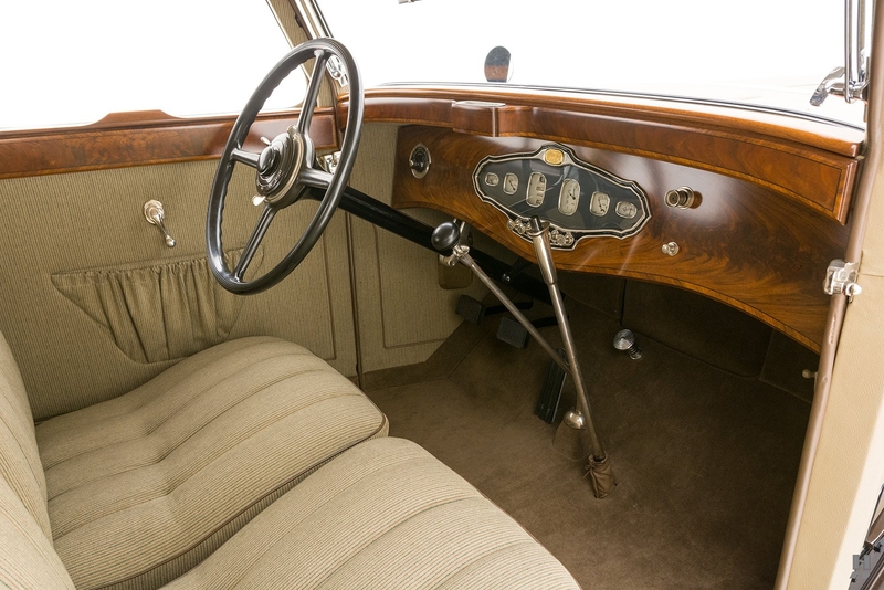 Foremost among the Chateau series was the Monte Carlo, a captivating and sporty four-door saloon with an aggressively low roofline, letterbox side windows, and an integrated trunk. The magnificently stylish body featured Weymann’s patented, aircraft-inspired construction, comprised of a painstakingly crafted wood frame wrapped in a padded synthetic leather material that was both extremely lightweight and durable. Greased paper insulated some wooden joints, while others were precisely spaced to prevent rubbing with the wood’s natural expansion. Weymann’s ultimate goal was to produce a body that was virtually free of squeaks and, in Stutz marketing jargon, “guiltless of rattle.” Of course, this process was massively labor-intensive, and at $4,495 in 1930, the sublime Monte Carlo was one of the most expensive models in the range.